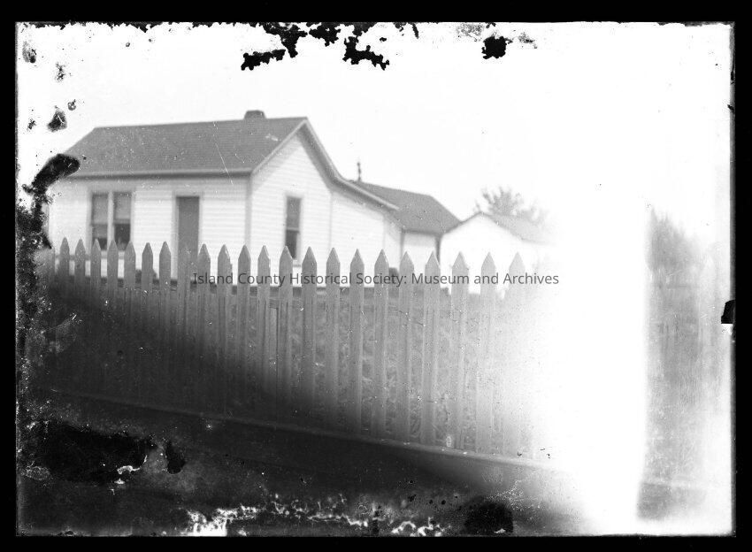 A white house (three visible windows) with two additional houses or sheds next to it. The buildings are behind a tall, unpainted picket fence. White blur on right side of image; corroded edges.Made/Created
