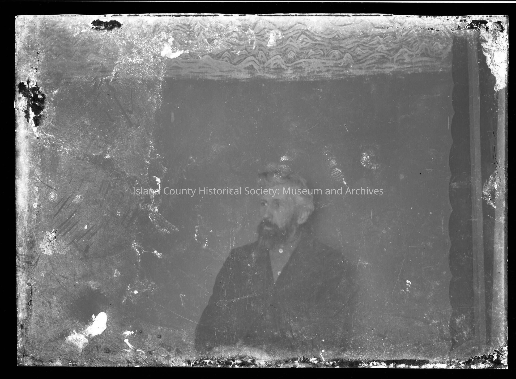 Heavily corroded image. Photograph of a man. Man has white and/or gray hair and a dark beard and mustache. He is wearing a dark coat buttoned up with a lighter colored button up shirt visible underneath it. He is looking to the left of the image.Made/Created