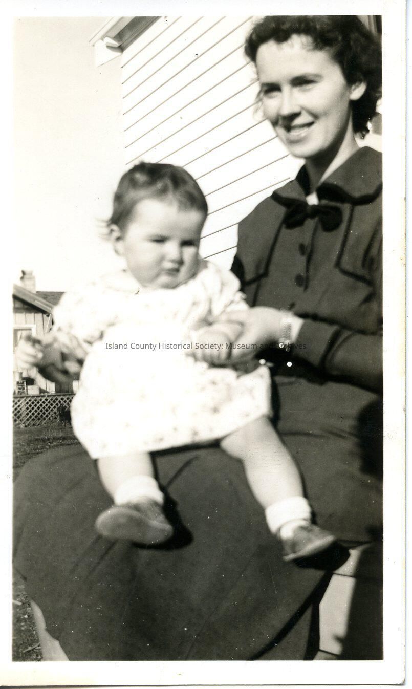 A black and white photo of a woman with a baby on her lap. The woman has dark hair and is wearing a dark colored jacket and skirt. The baby is wearing a light colored dress. The back of the photo says "Dorothy and Mimi"Collection
