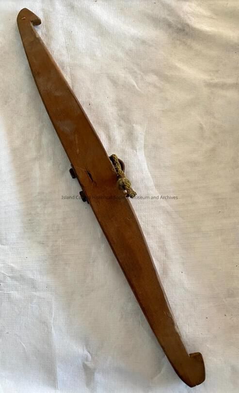 A small, hand carved yoke with a piece of rope tied to it. Possiby used for smaller animals, or possibly used to carry multiple buckets at the same time.