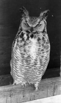 Photo of a great horned owl facing to the right of the camera on a perch in a small bird coop. The owl looks to have a scowl.Collection