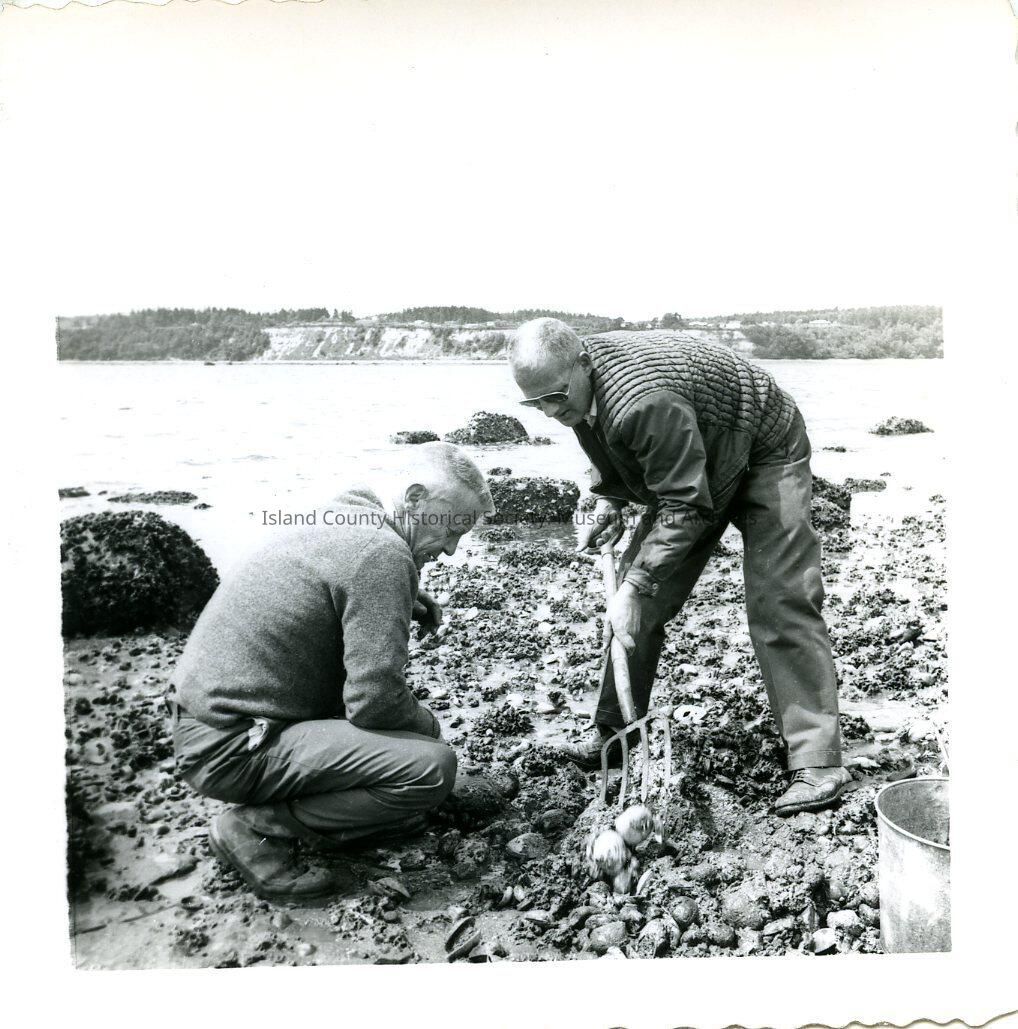 A black and white photo of two men using a pitchfork on the beach.Collection