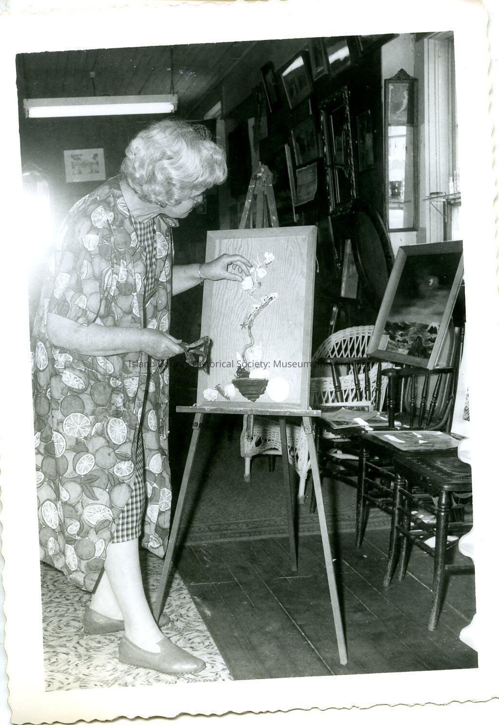 A black and white photo of a woman in a dress standing in a room with an art piece. The woman is likely Dorothy Neil. The back of the photo reads "I decorated at CC office. 1962"