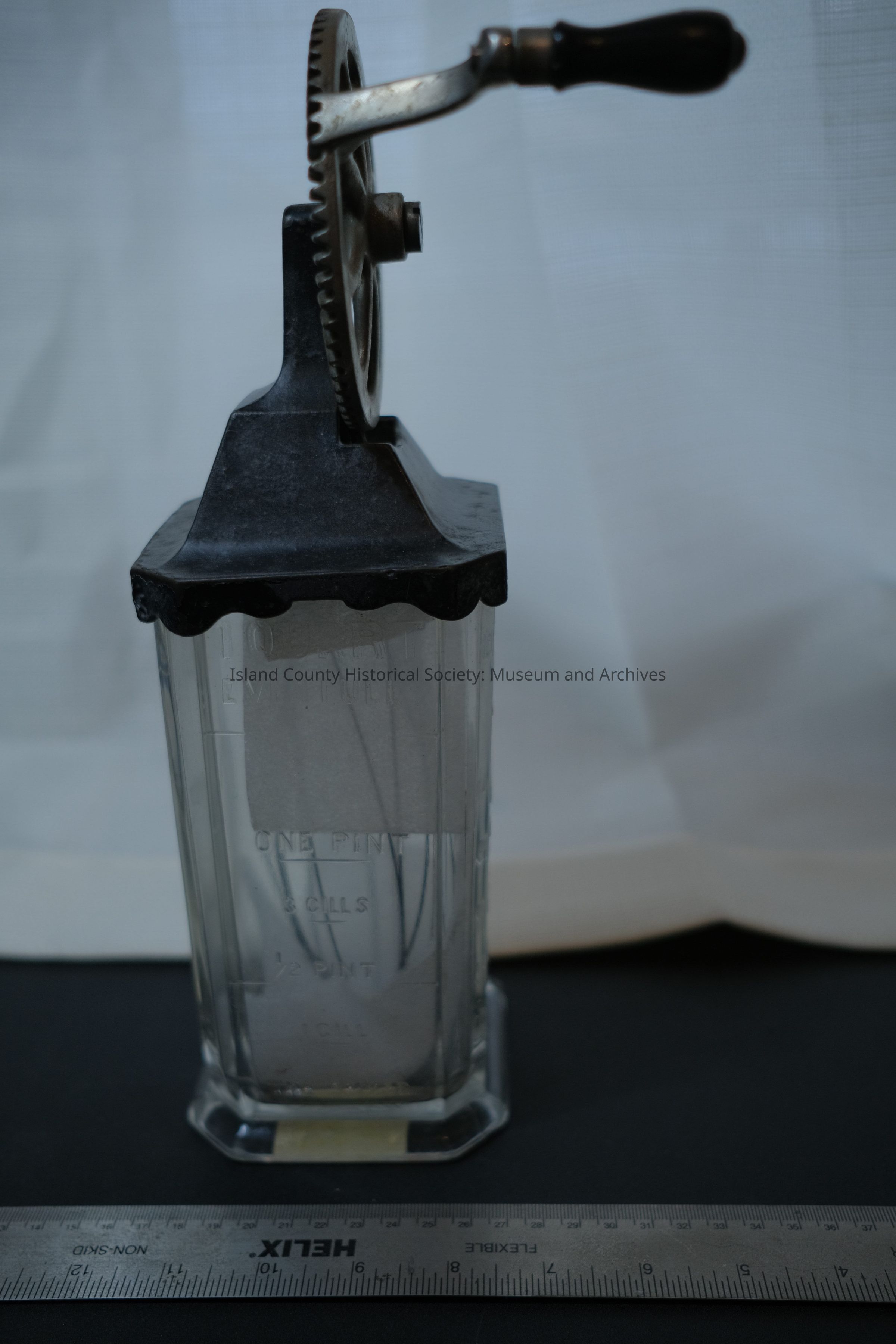 tall glass hand mixer for wet or dry ingredients w/ measurement markings along side, metal hand crank and whisk