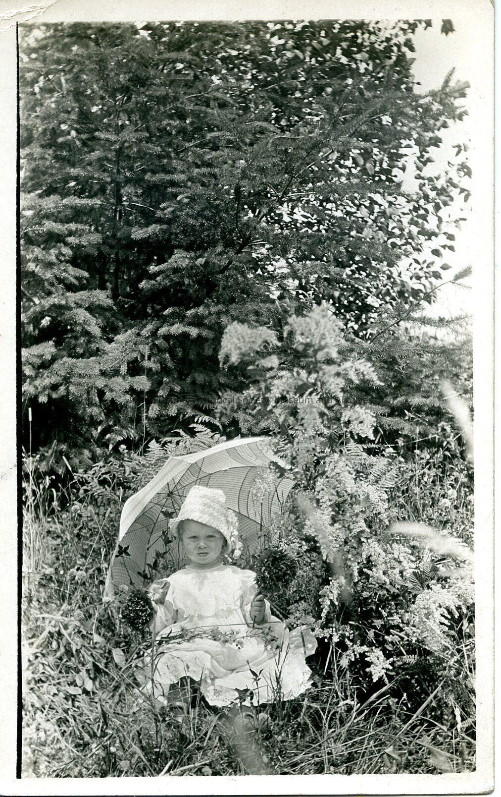 A black and white postcard of a young girl sitting in the forest with an umbrella. The back of the postcard reads "Dorothy Lee Burrier, one year, Mt Vernon. May day 1911"Collection