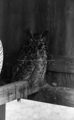 Photo of a great horned owl facing to the camera on a perch in the back of the bird coop, the snowy owl looks to be slightly in the photo, on the left, showing its left wing.Collection