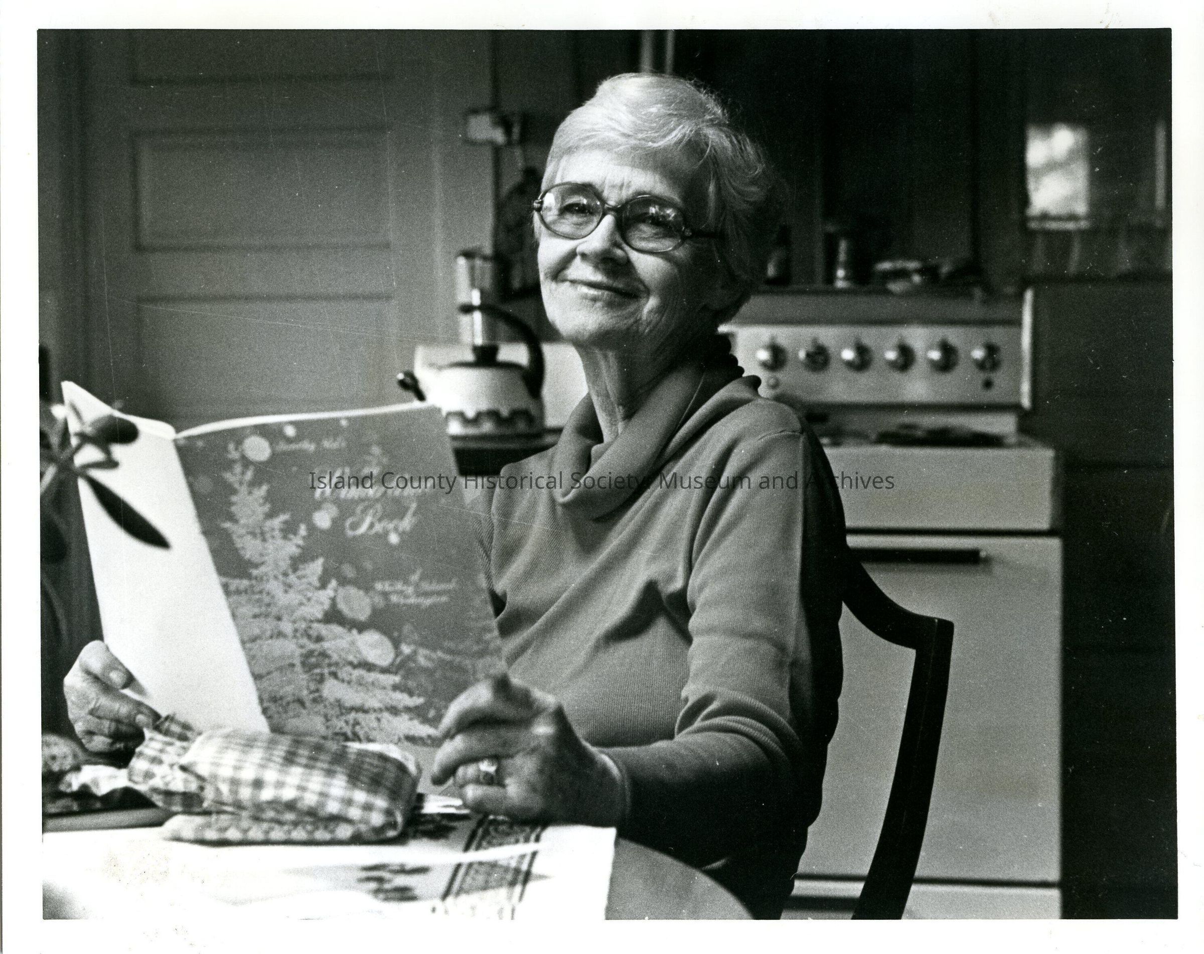 A black and white photo of a woman reading a book at a table. The woman has short light hair and is wearing glasses.