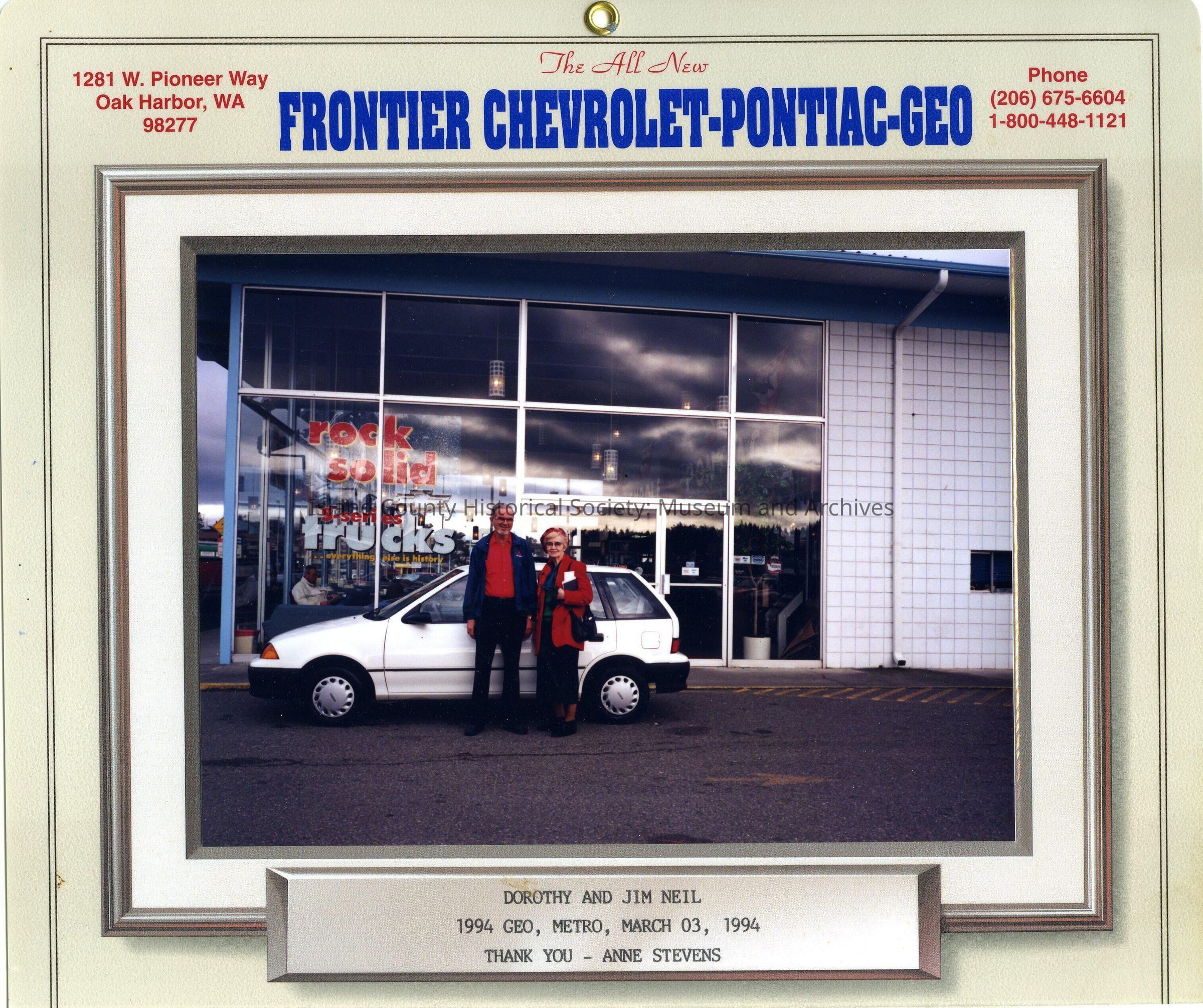 A color photo of Dorothy and Jim Neil in front of a white car. The photo reads "The All New Frontier Chevrolet Pontiac GEO. Dorothy and Jim Neil 1994 GEO Metro March 03 1994 Thank You - Anne Stevens"