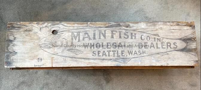 A wooden crate with Main Fish Co Inc. Wholesale Dealers, Seattle Wash. Stamped on the front side in black ink.Collection