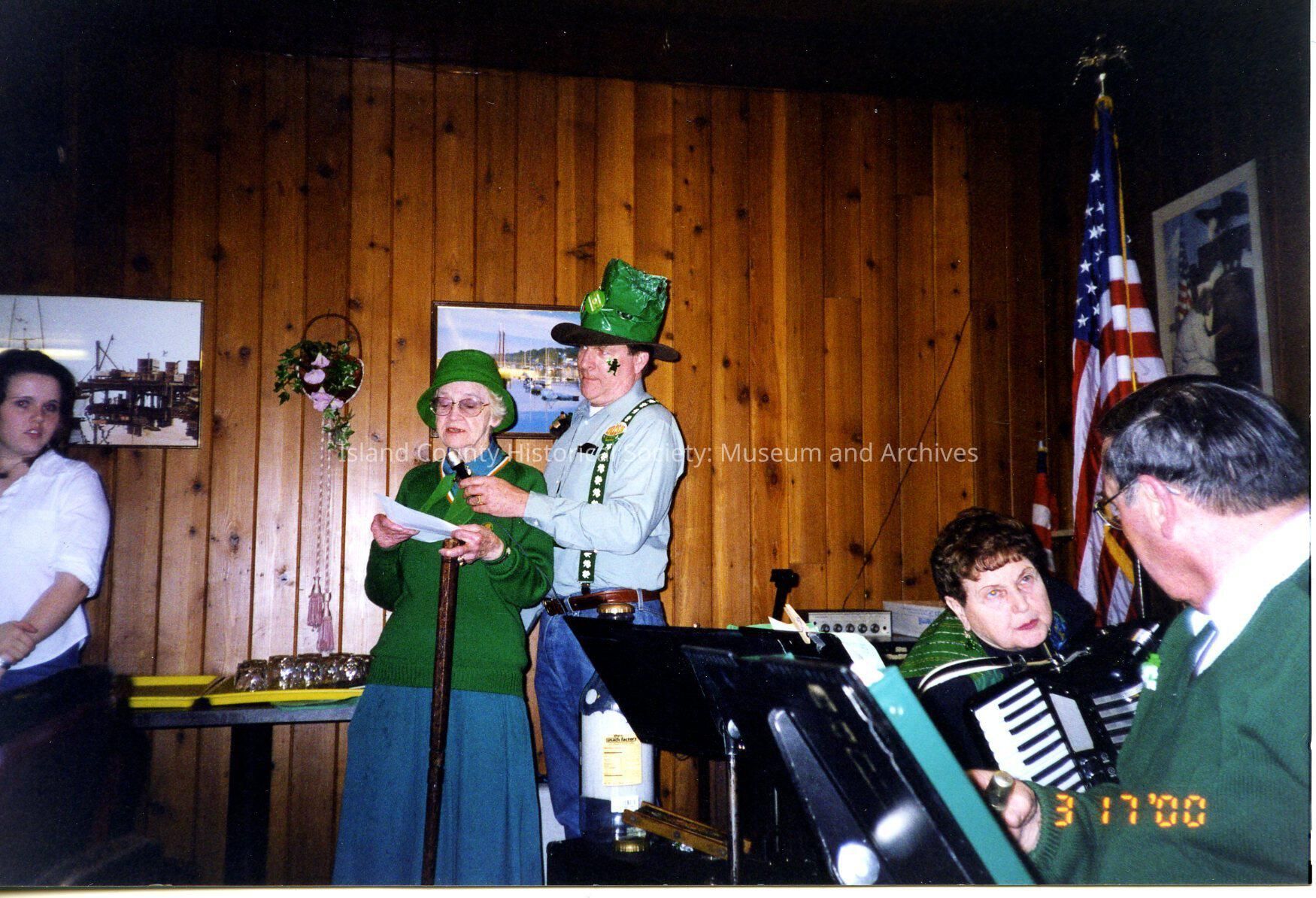 A color photo of Dorothy Neil reading and speaking into a microphone. A man in a green hat is holding the microphone for her. She is wearing a green hat and cardigan. It appears to be a Saint Patrick's Day Event.