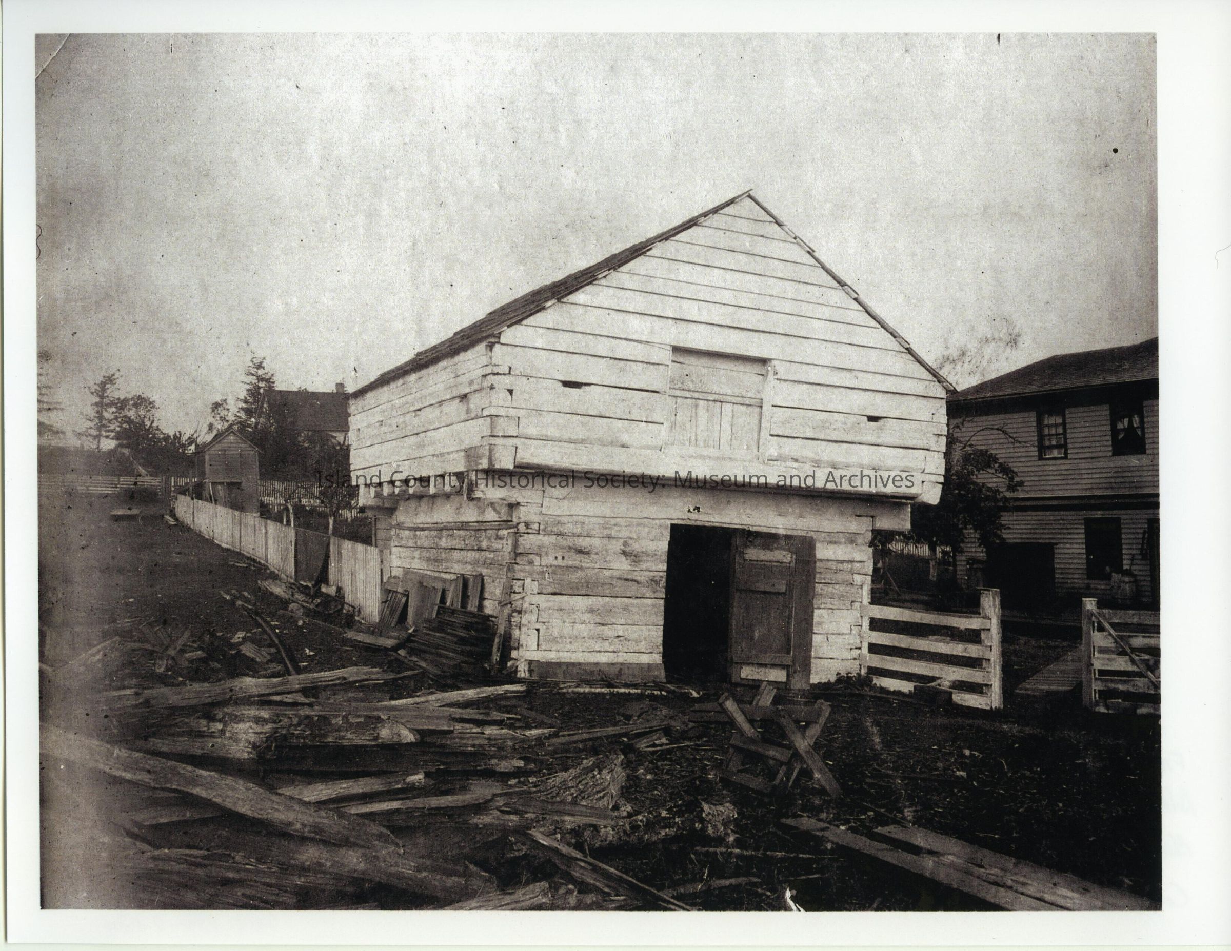 Print. Alexander blockhouse. The blockhouse is two levels with the second story level longer and wider than the first level. The blockhouse is surrounded by building materials. Considering that the blockhouse appears leaning, or twisted, perhaps a restoration is in progress. On reverse: From Album 40 Alexander Blockhouse. Blockhouse Inn to R. Collected by Lem Wannamaker