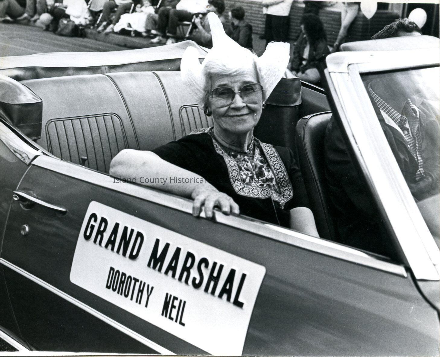 A black and white photo of a woman sitting in a roofless car. The woman is wearing a hat and the side of the car reads "Grand Marshall Dorothy Neil" The back of the photo reads "1992 HA Parade"Collection