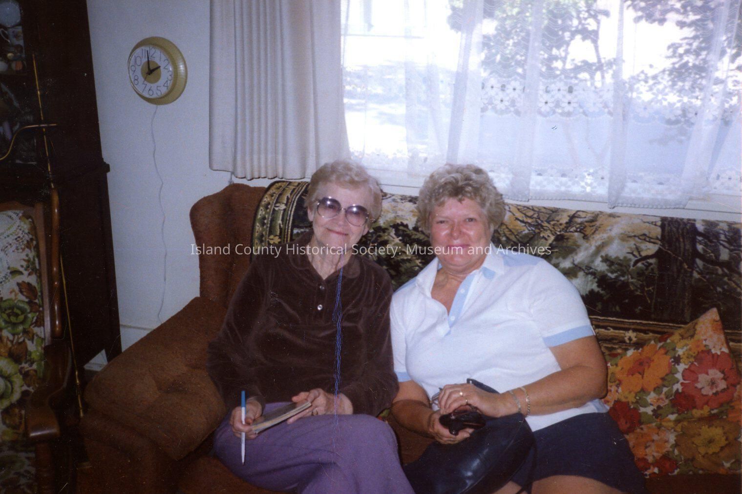 A color photo of Dorothy Neil sitting on a couch with another woman. The back of the photo reads "Aug 1989 Dorothy and Patty Higgenbottom 1989."
