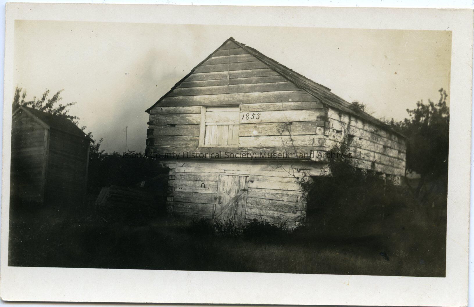 Print. Alexander blockhouse. The blockhouse is two levels with the second story level longer and wider than the first level. The date 1855 appears on the front of the upper level. The reverse side shows a postal card format.Relationships
