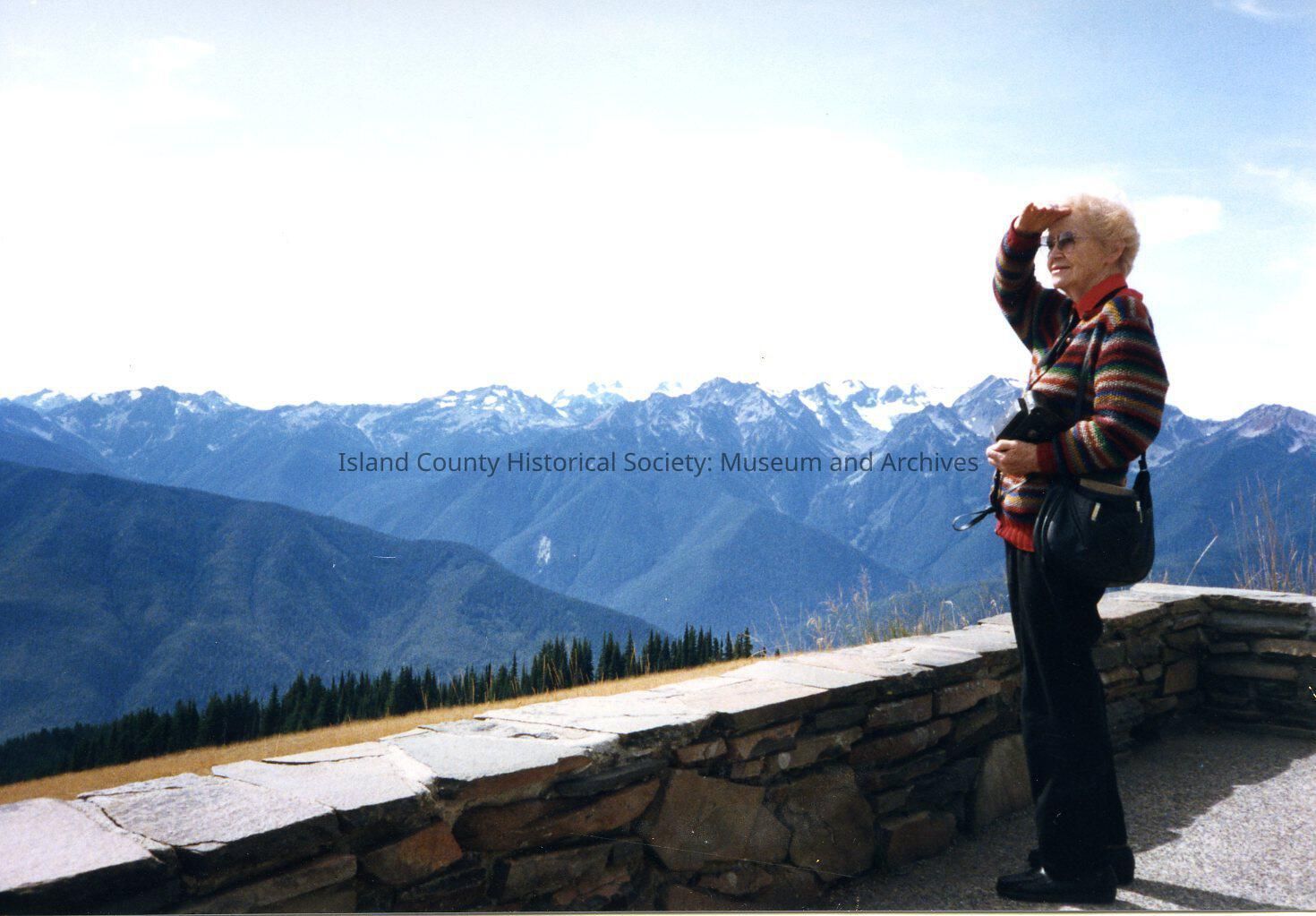 A color photo of Dorothy Neil standing looking out at the Olympic Mountains at Hurricane Ridge, Washington. The back of the photo reads "Hurricane Ridge Sept 1922 Olympic Mtns One can see forever"Collection