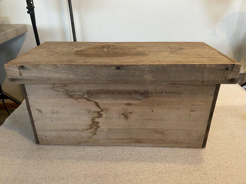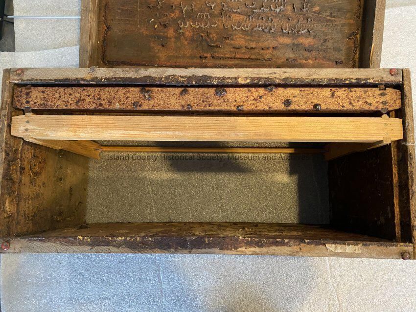 A wooden bee box. langstroth style hive, with two wooden frames inside (missing several). One frame looks unused while the other has wax remnants stuck to it.