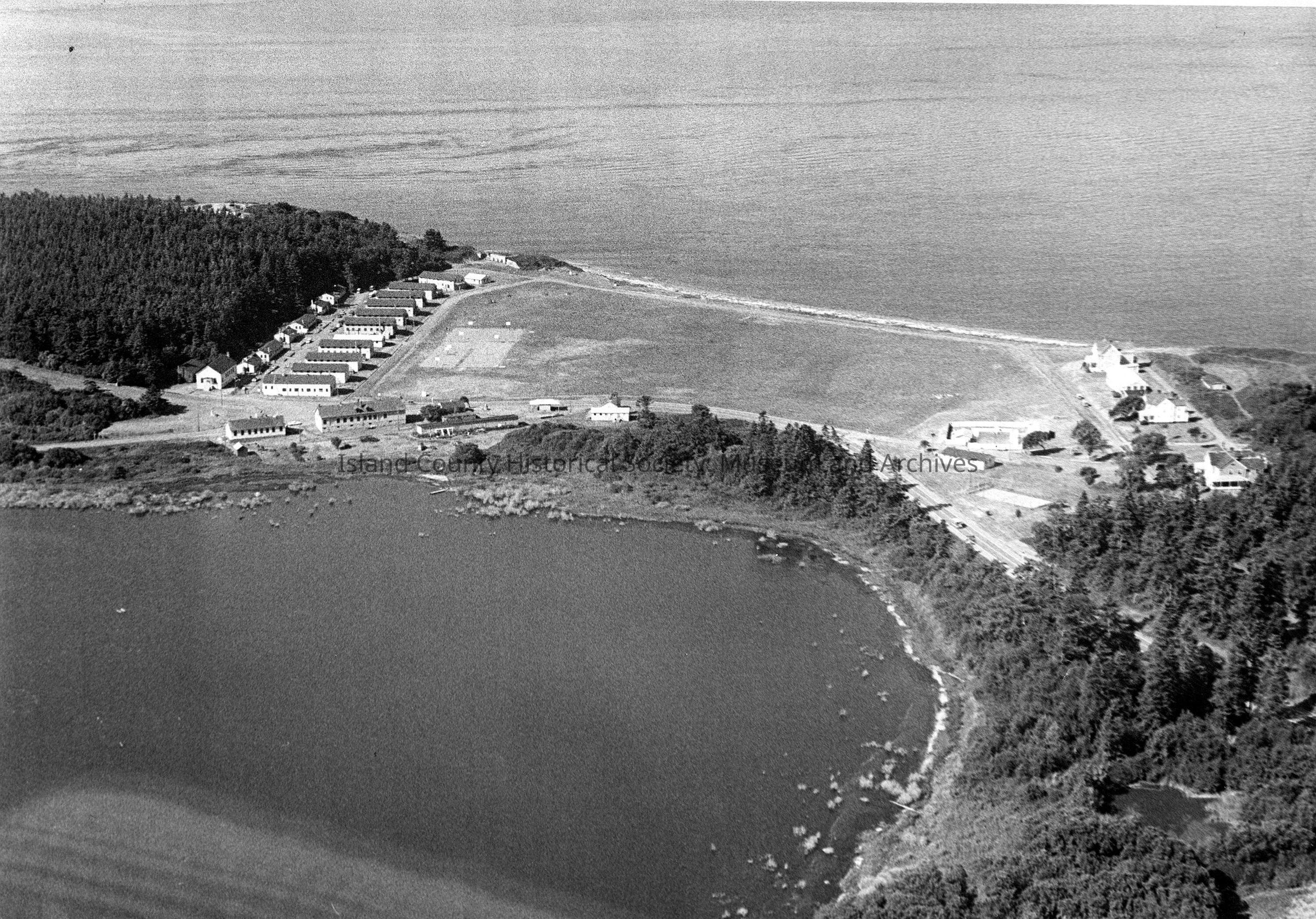 Fort Casey Cantonmant area. Crockett Lake in forground, Admiralty Inlet top of image. Image taken in the 1960's. Note the swimming pool installed by Seattle Pacific University.