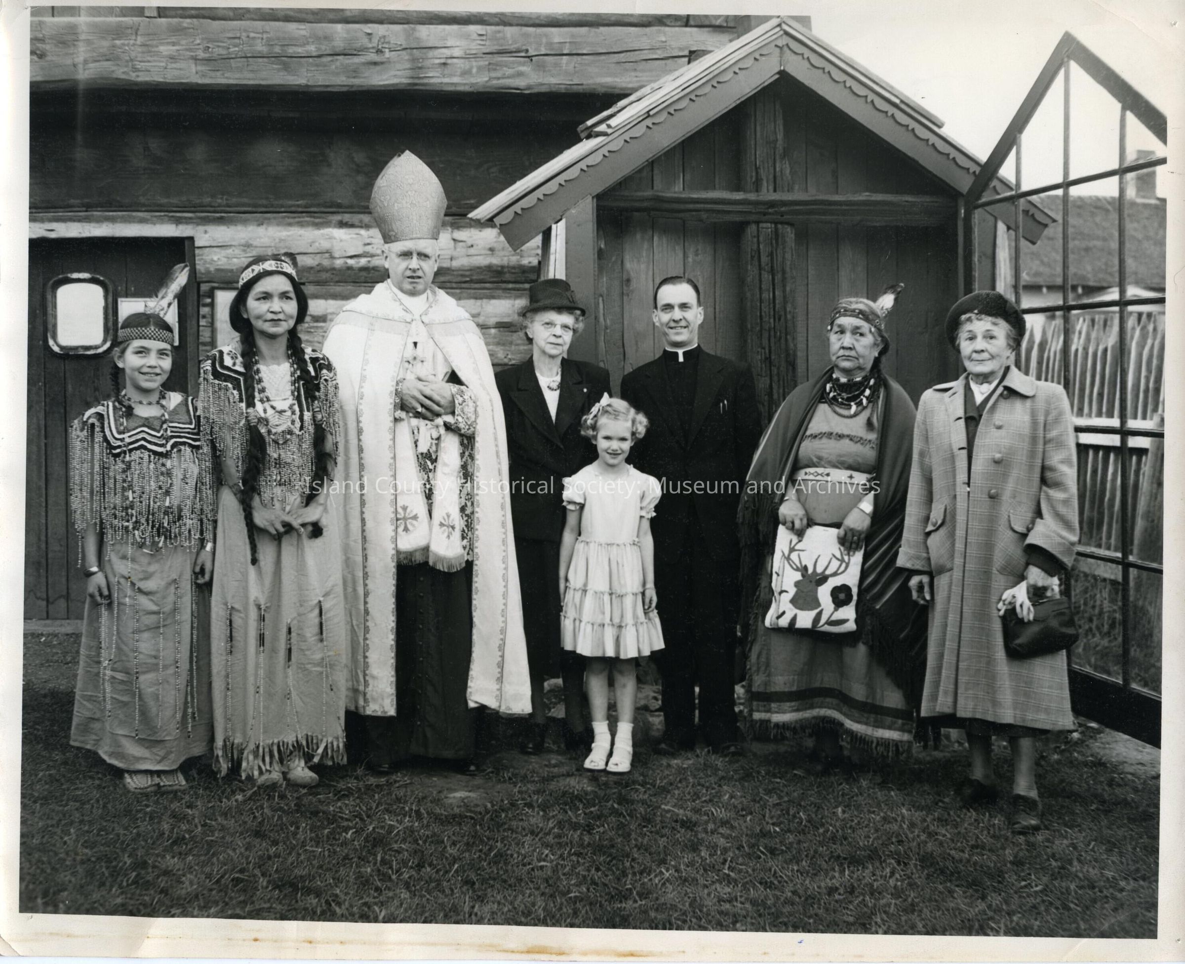 Print. Dedication of blockhouse - 1930. In front of protective shelter for 1840 cross presented by missionaries are: Carolee Engle, Ida Sill the Pastor of St Marys with the Bishop at dedication of blockhouse - 1930Lexicon