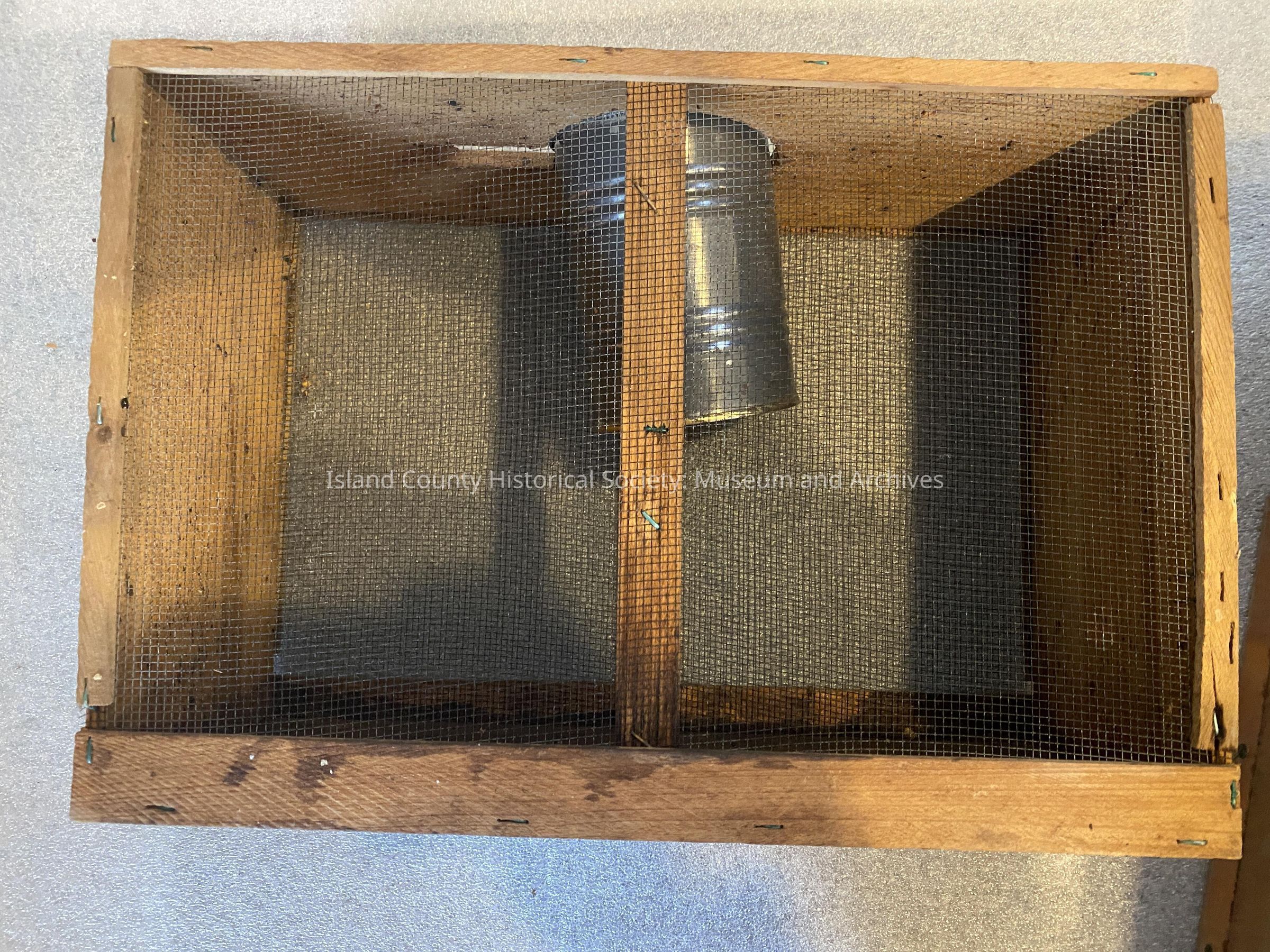 A wood and mesh box for storing a package of bees before installing them into a hive. There is a metal can attached to the top that would have contained sweet syrup for the bees to feed on while in transit and before being let into their new home. Package is missing the queen excluder.