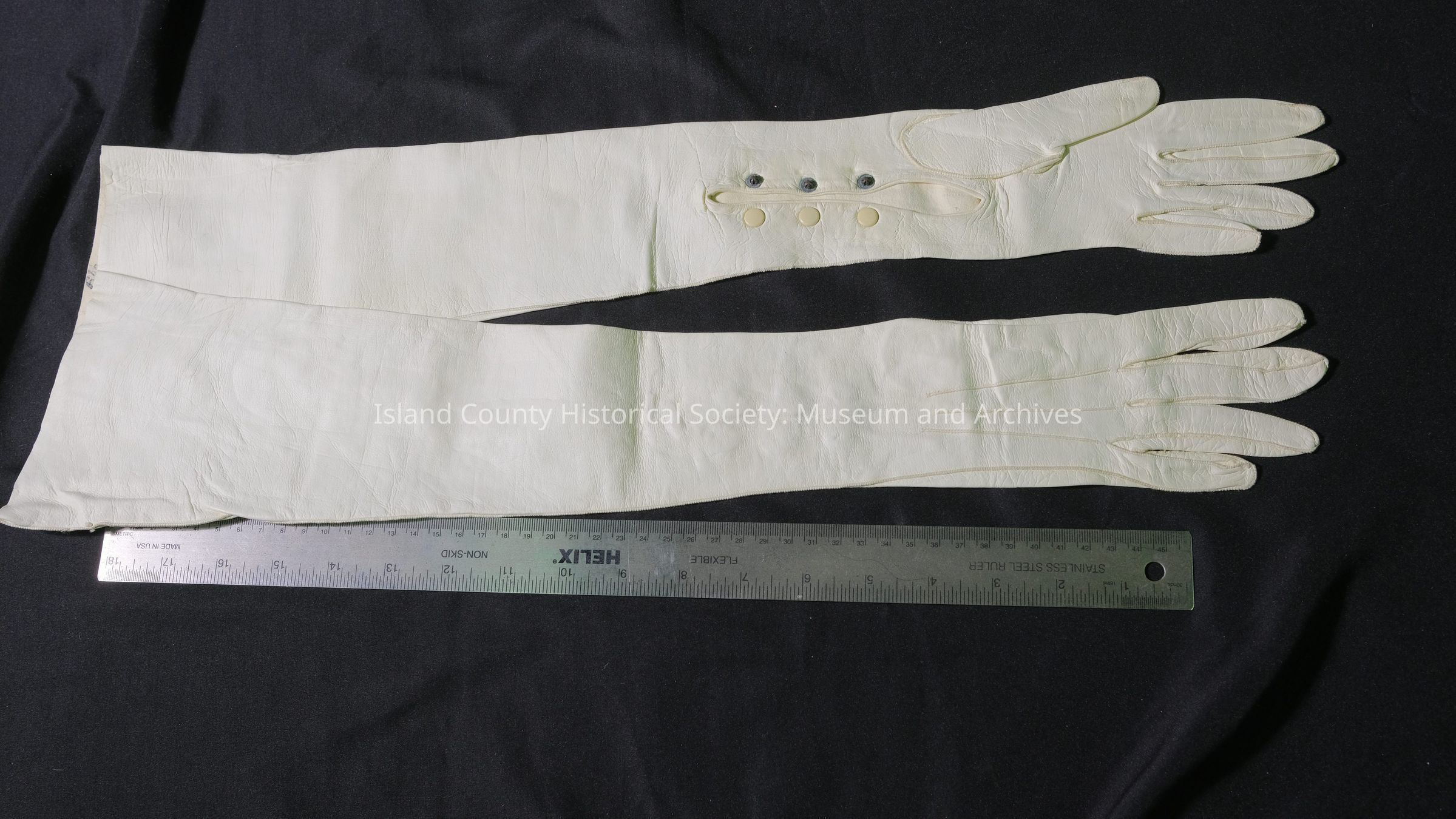 White kid gloves, 20" in length. (a&b)