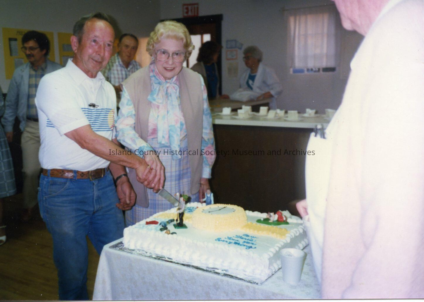 Man and woman cutting cake. Coupeville Rec hall. Lou Naddy, Chris Chistensen written on back.