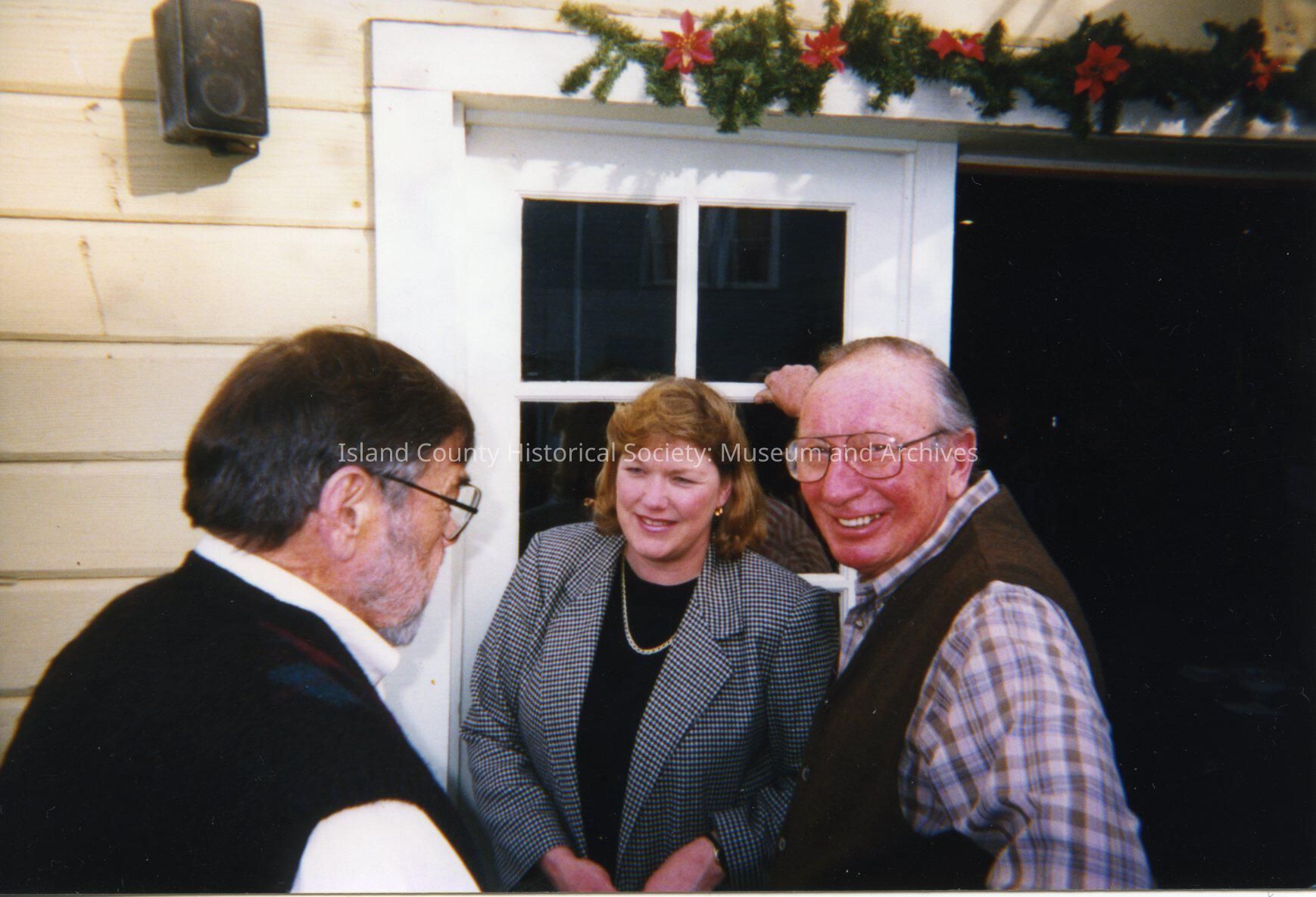 Three people standing outside doorway which is decorated with evergreen and poinsettia garland. Del Bennett, Nancy Conard, Michael Canfield.