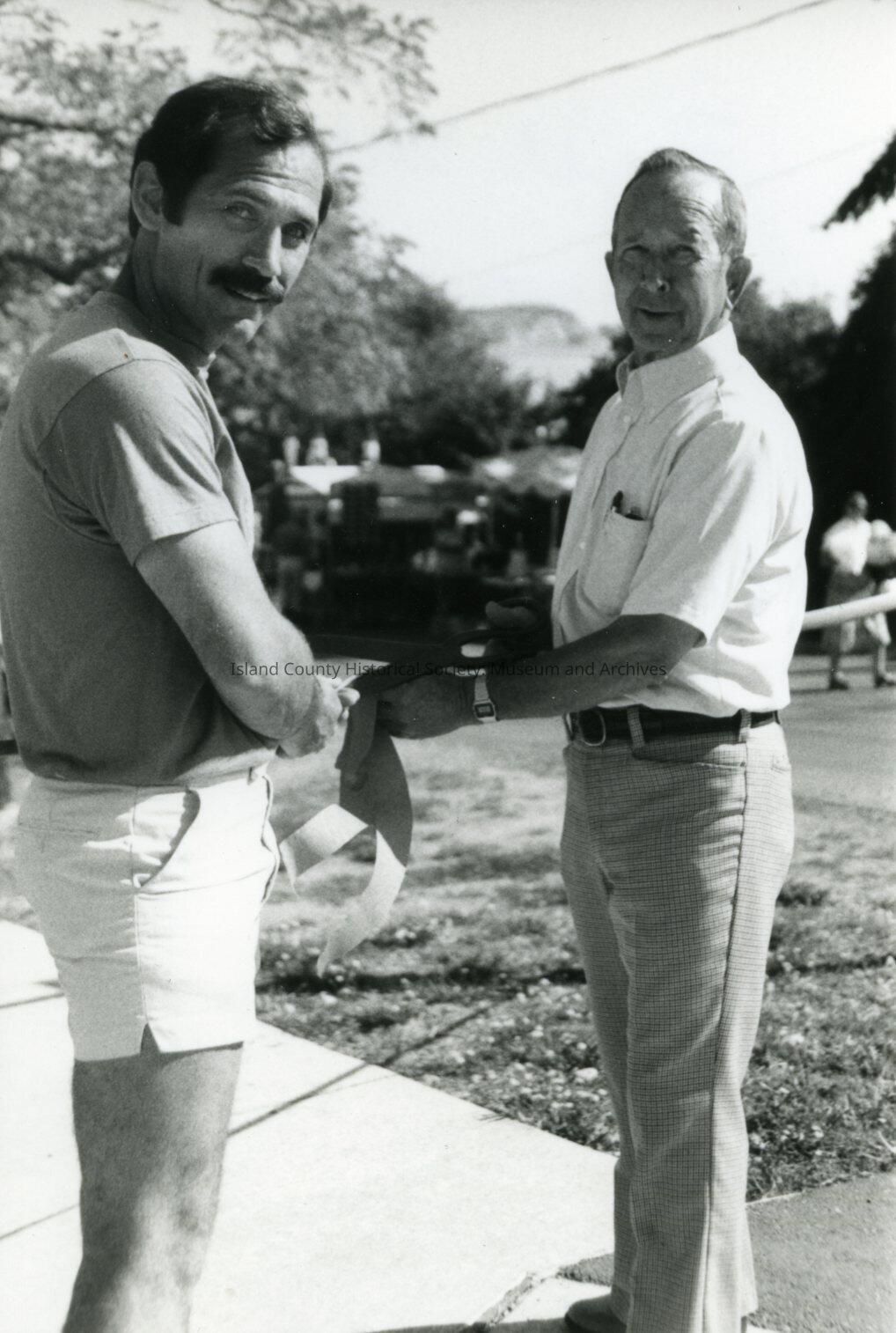 Two people standing with ribbon for opening of Coupeville Arts and Crafts Festival. Lew Naddy and Bill Evans.