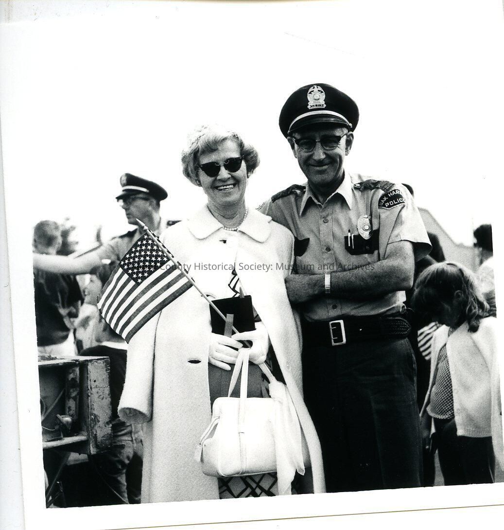 A black and white photo of Dorothy Neil standing next to Mel Neil in a uniform. She is holding an American Flag.