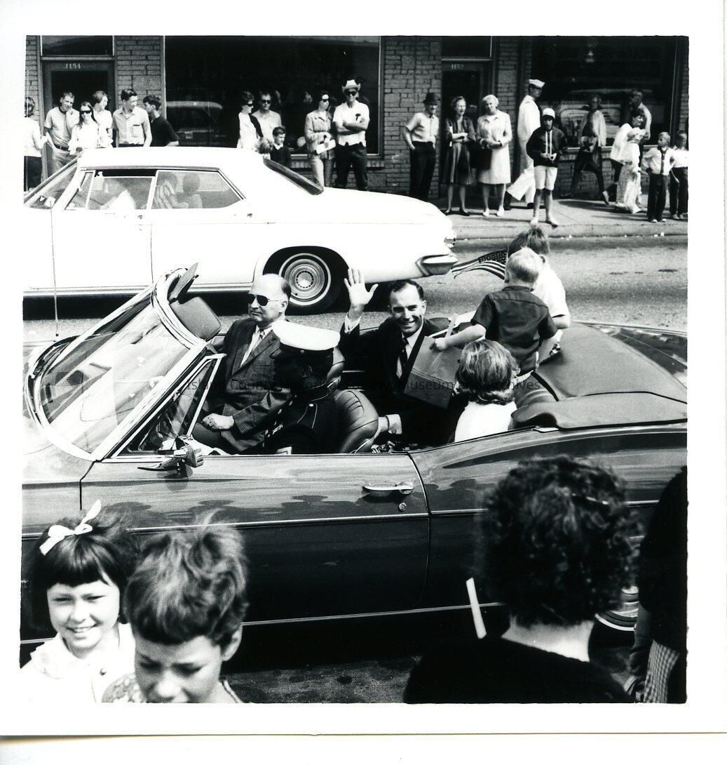 A black and white photo of multiple people including children in a roofless car in a parade.