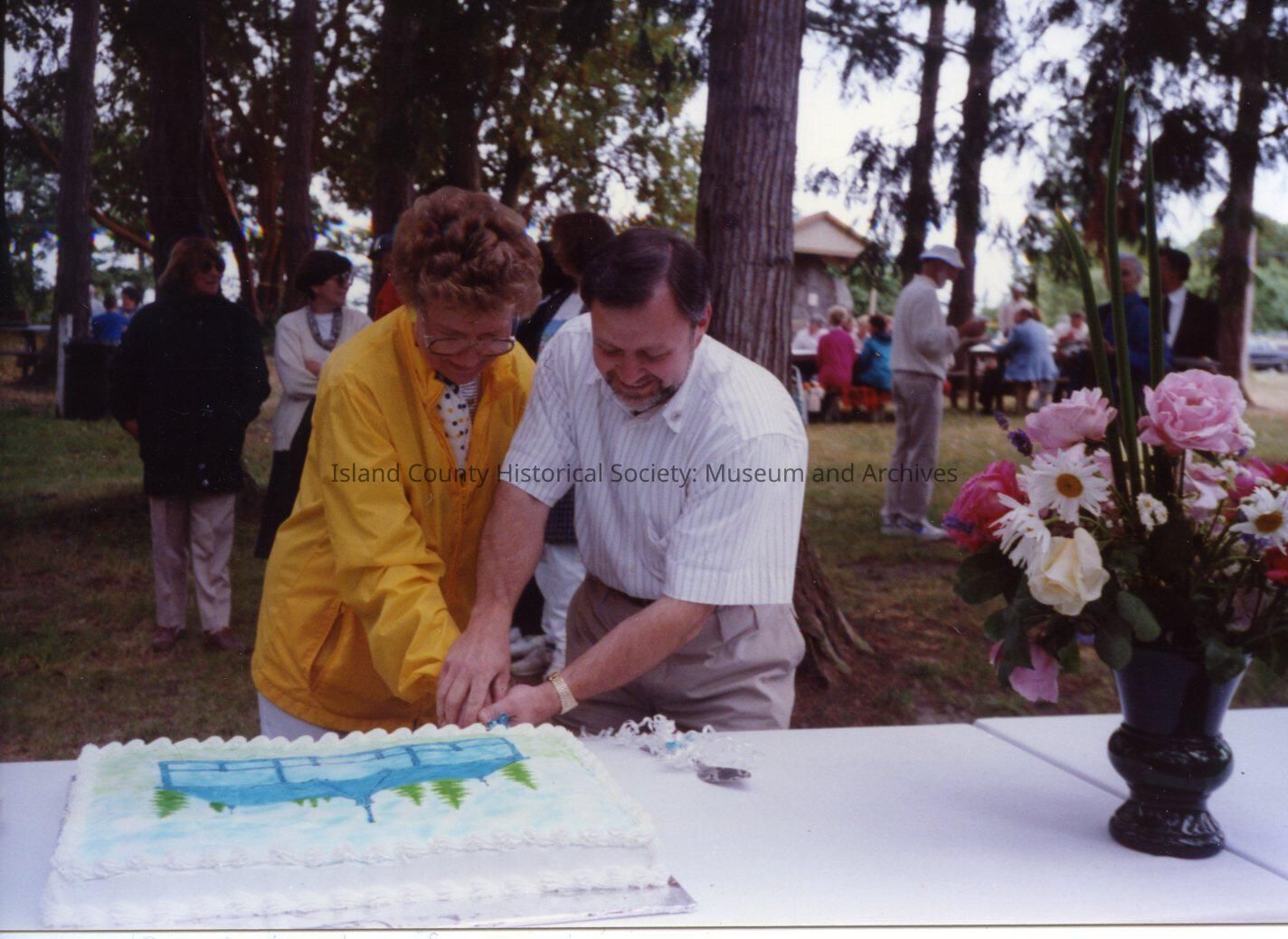 Mayor Betty Coyne and David Howell cutting cake at dedication of pavillion in Coupeville town park. People standing and at tables in background.