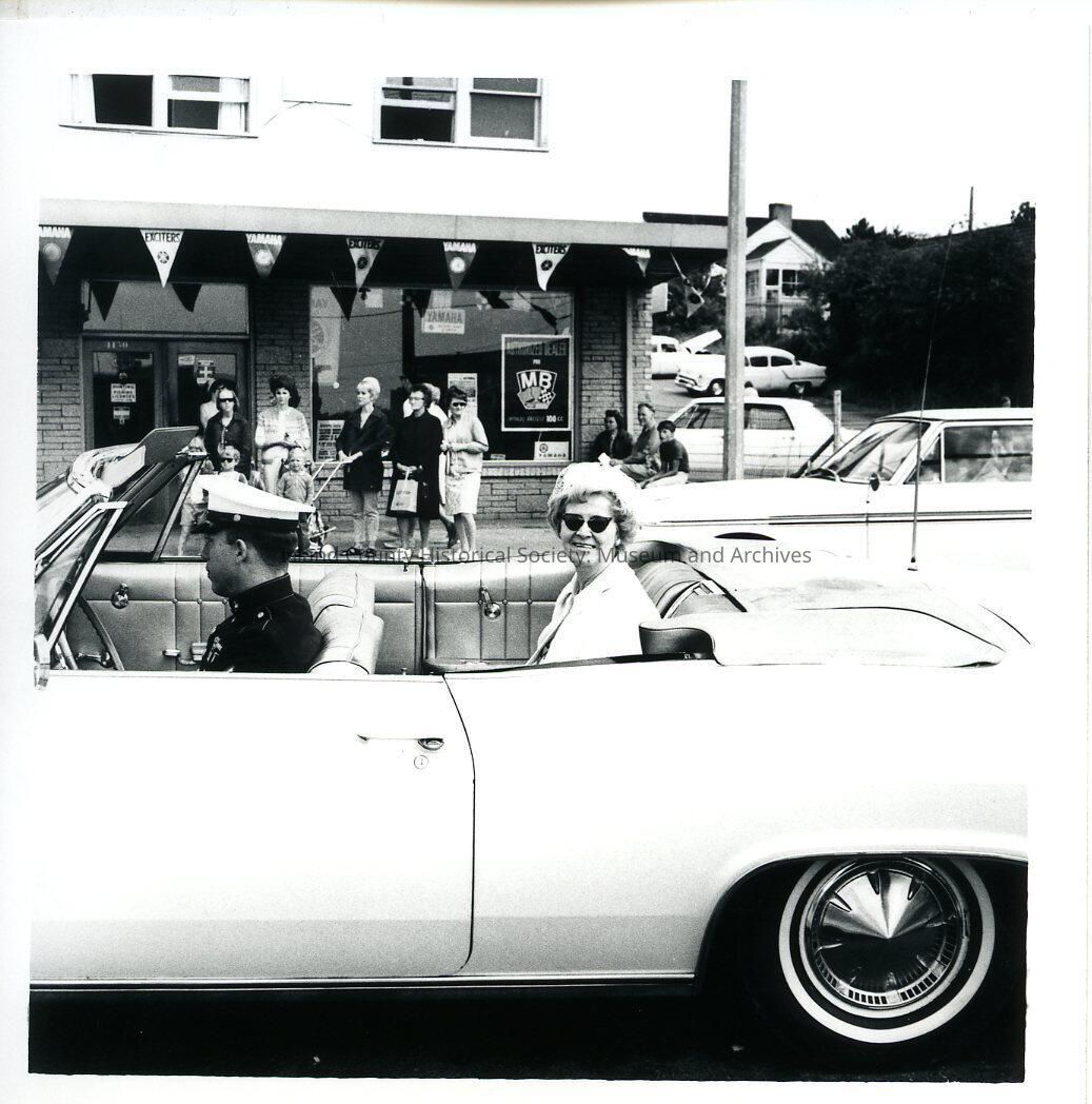 A black and white photo of Dorothy Neil in a roofless car in a parade