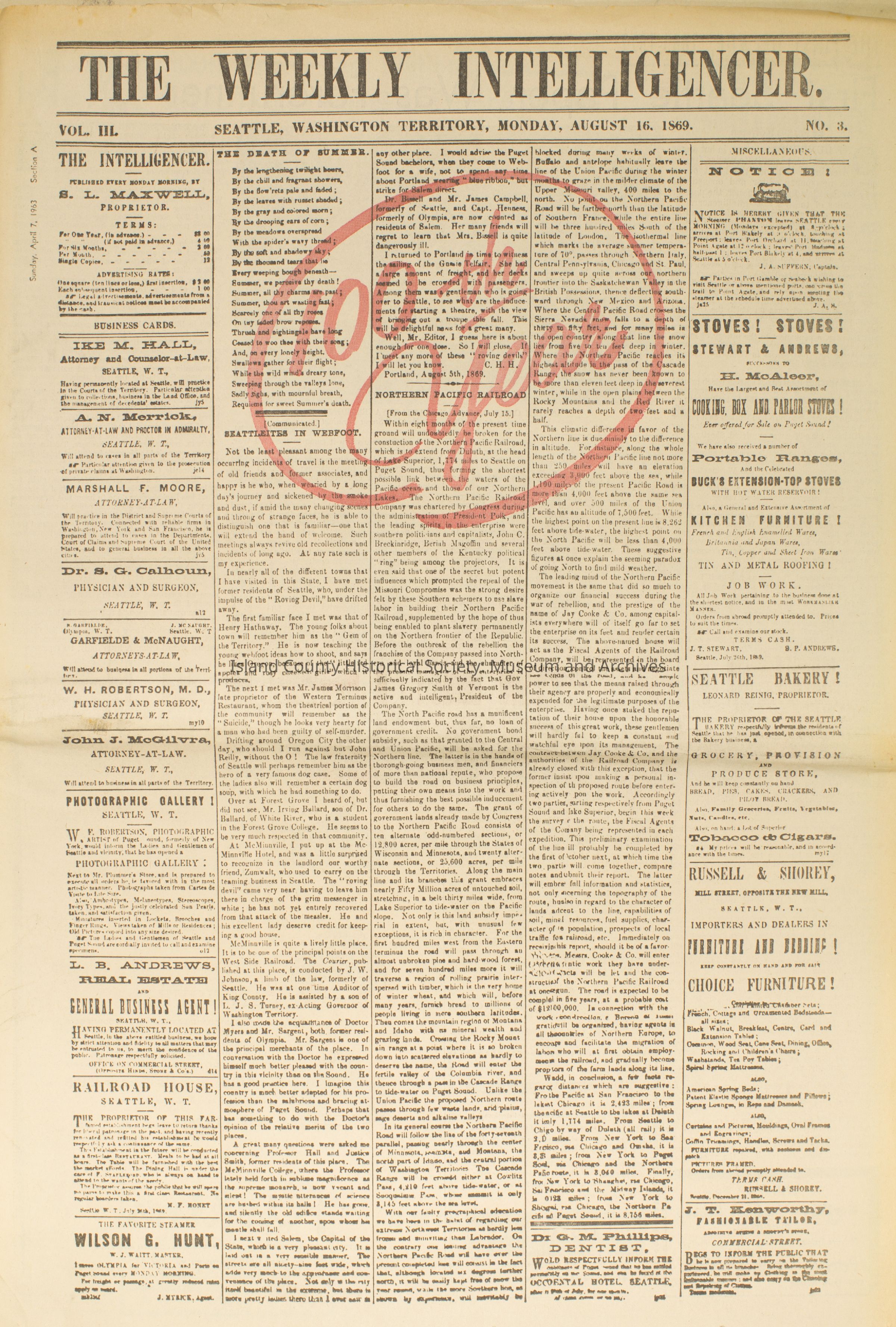 The Weekly Intelligencer, August 16, 1869 Commemorative Edition: A re-publication to celebrate the newspaper's 100th year, commemorative edition published April 7, 1963Publication Details