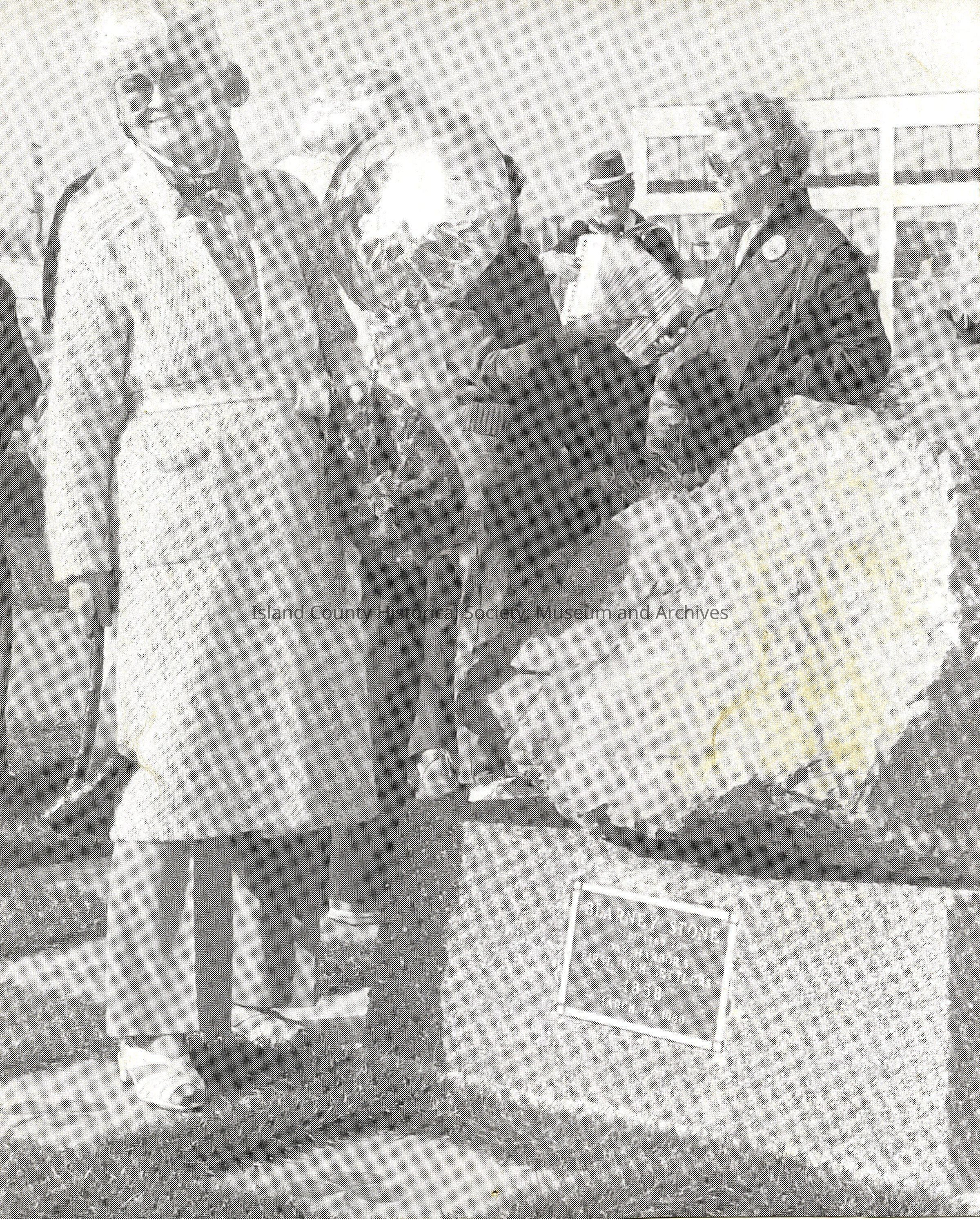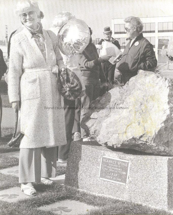 A black and white photo of Dorothy Neil standing next to a "Blarney Stone" in Oak Harbor.