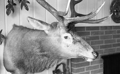 Deer with antlers mounted on white paneled wall, three leaves on the wall near the deer. Left side view of the mounted head. Brick fireplace visible on the right side of the image. Dark plaque hung on the wall above the fireplace.Collection