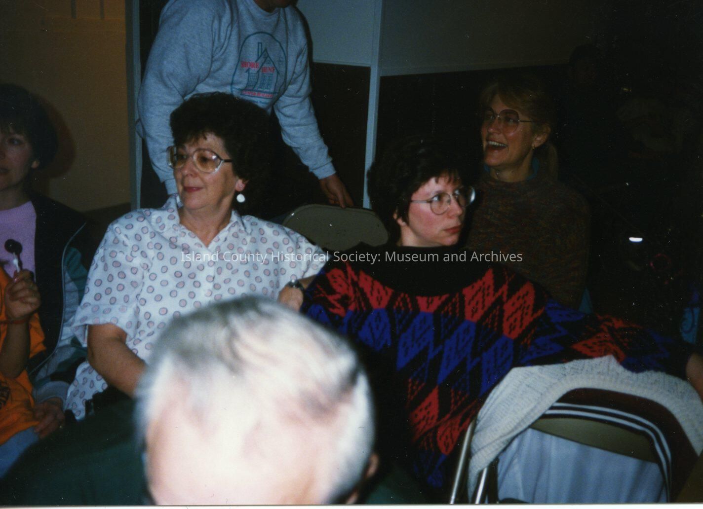 Color photo of people sitting on folding chairs. Lyla Snover in left center and Kathleen Jo Ryan in rear are identified on back.