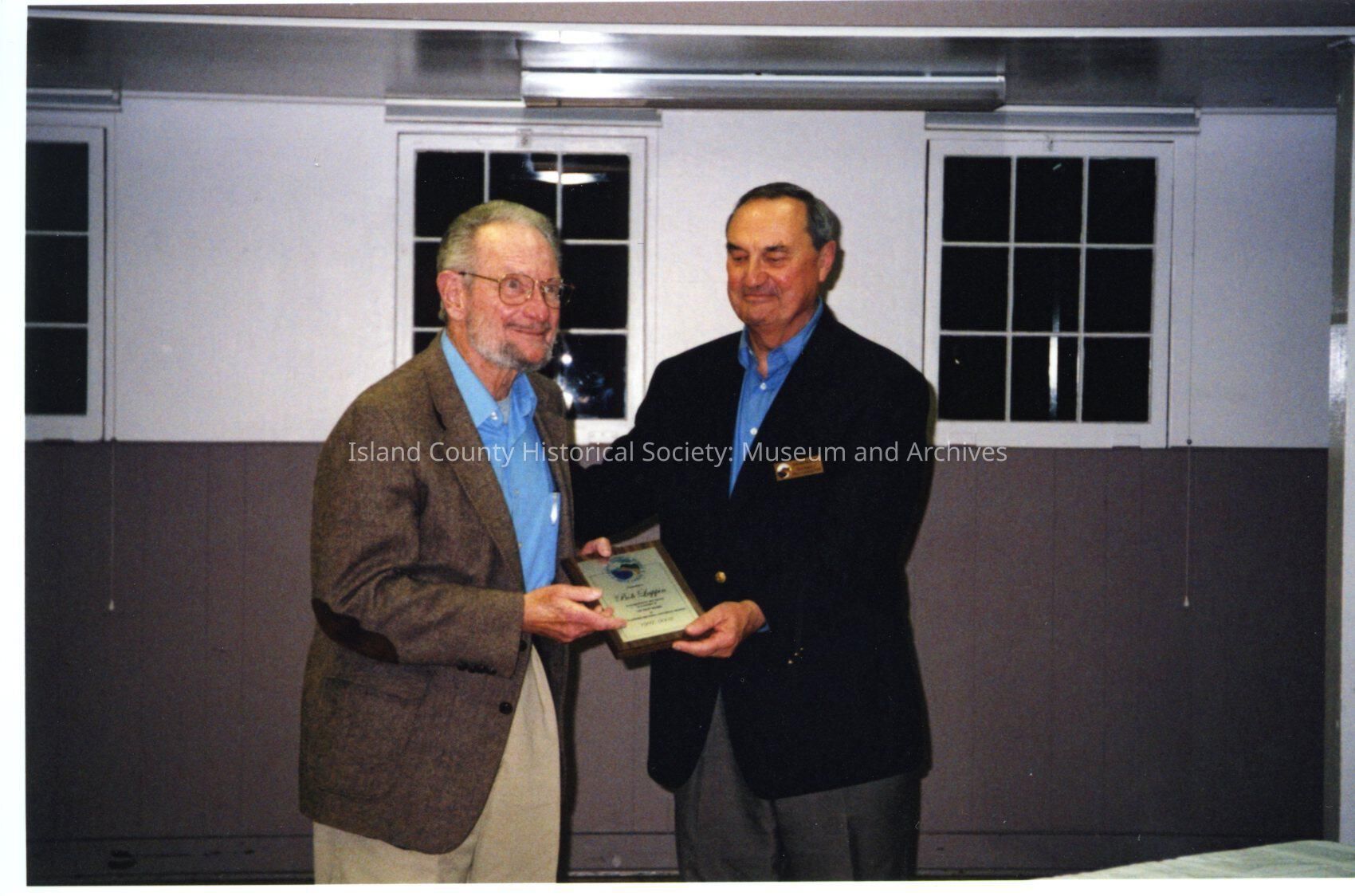 Color photo of Bob Lappin receiving plaque with Friends of Ebey's logo from Jim Konopik. Indoors at Rec Hall in Coupeville.
