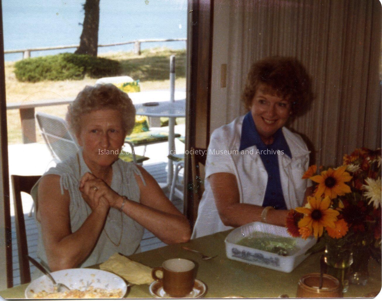 A color photo of two women sitting next to each other at a table. The back of the card reads "Jo Van Kal Kay Zannich 1970s at Liz Gepney"