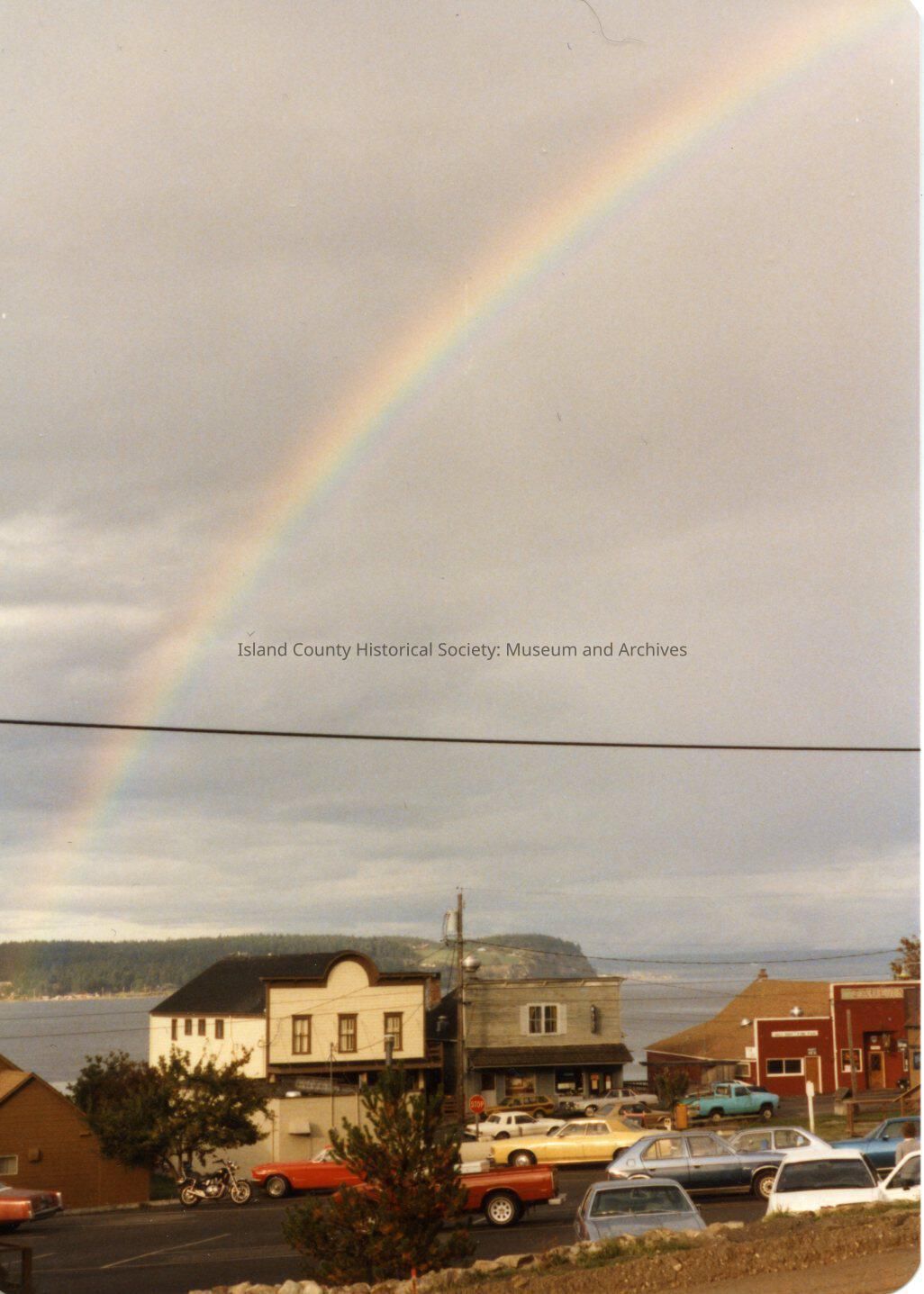 Color photo of rainbow above Penn Cove and Front Street in Coupeville. Taken from Coveland St. looking across Rec Hall parking lot. Toby's Tavern, cafe, and antique store. Photo print date of Jan. 1985 on back.