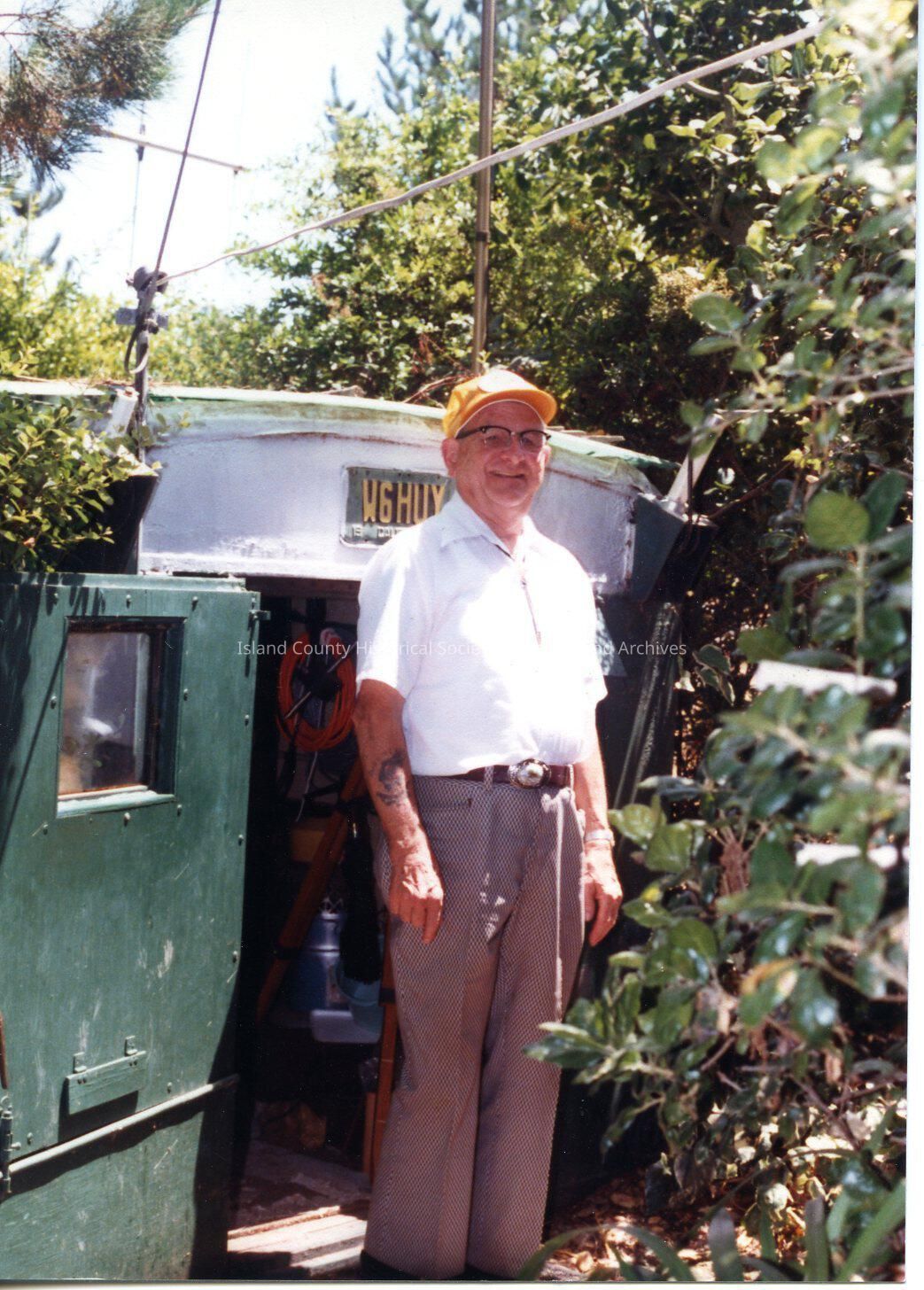 A color photo of a man standing in front of a car. The back of the photo reads "Romagne. Died 1992 in Cad. His father was Oak Harbor's first druggist.