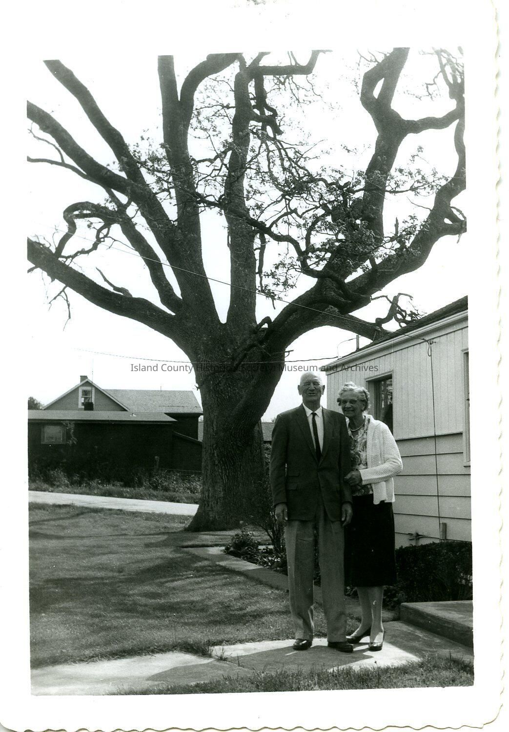 A black and white photo of a couple standing near a tree. The back of the photo reads "15 May 1964 Oak Harbor Wash, Augusta and Herman Keister and their biggest Gary Oak"