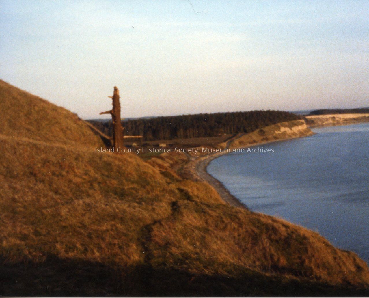 Color photo of Ebey's Landing taken from Perego's bluff trail. A tall stump is in foreground and Ferry House is visible.