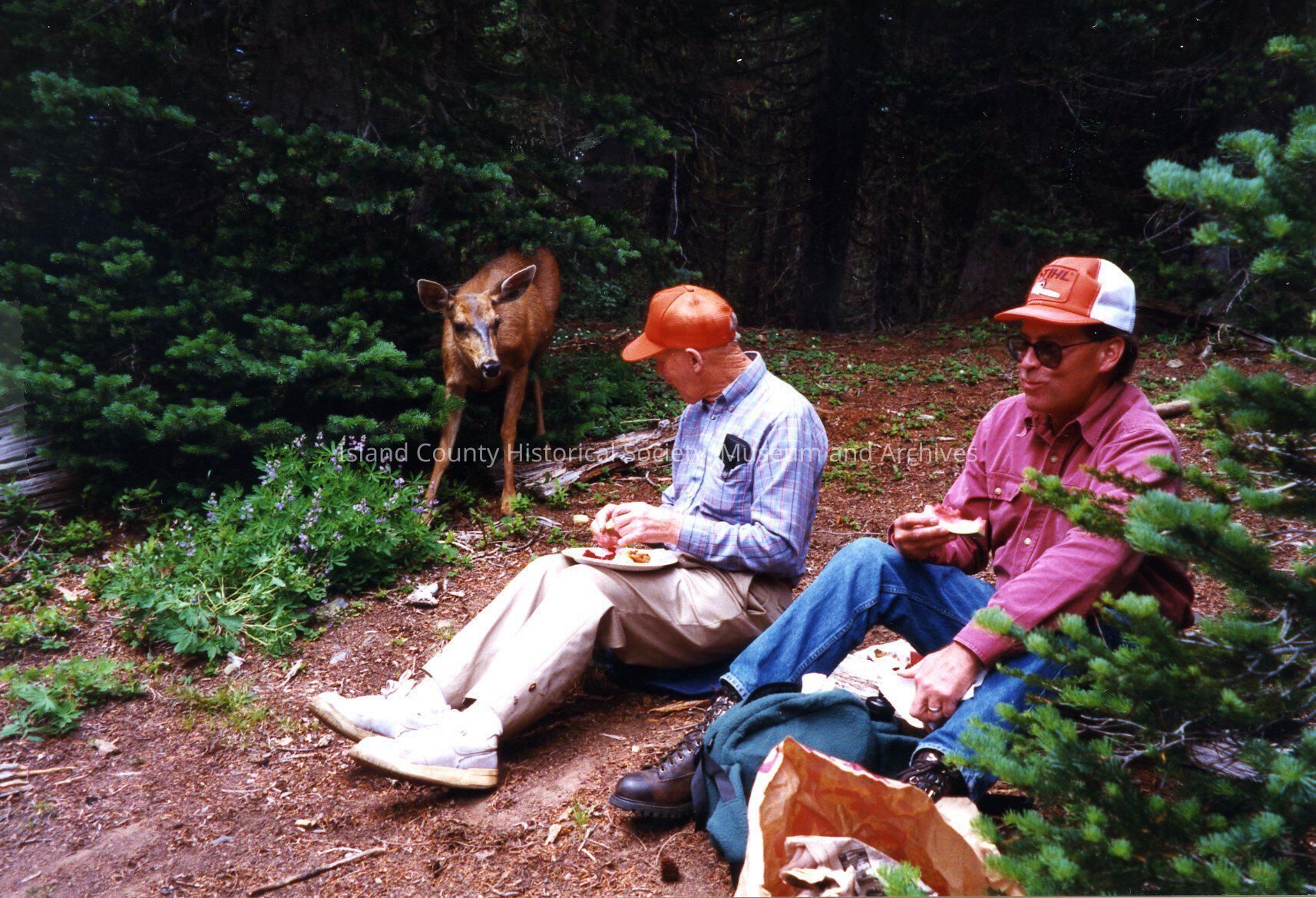 A color photograph of two men sitting on the ground in the woods with a black tailed deer nearby. The back of the photo reads "Bill Case and Bob Kline 1997 or 1998"