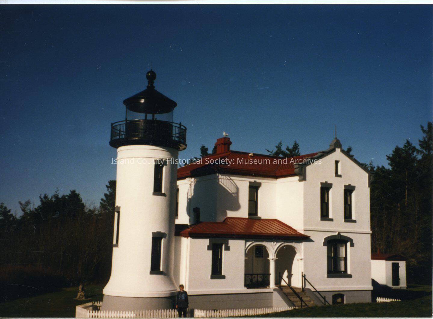 Color photo of Admiralty Head Lighthouse with person standing in front.