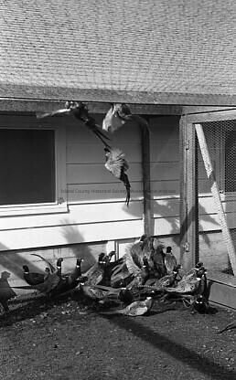 Two dozen plus game birds (pheasants) in a fenced enclosure. Birds have long feathers on their backside, dark crowns, and whitish bands of feather around their necks. Fenced enclosure has a wooden frame and is bordered on one side by a house (white, two visible windows). Three birds in flight at the top of the fenced enclosure.Collection