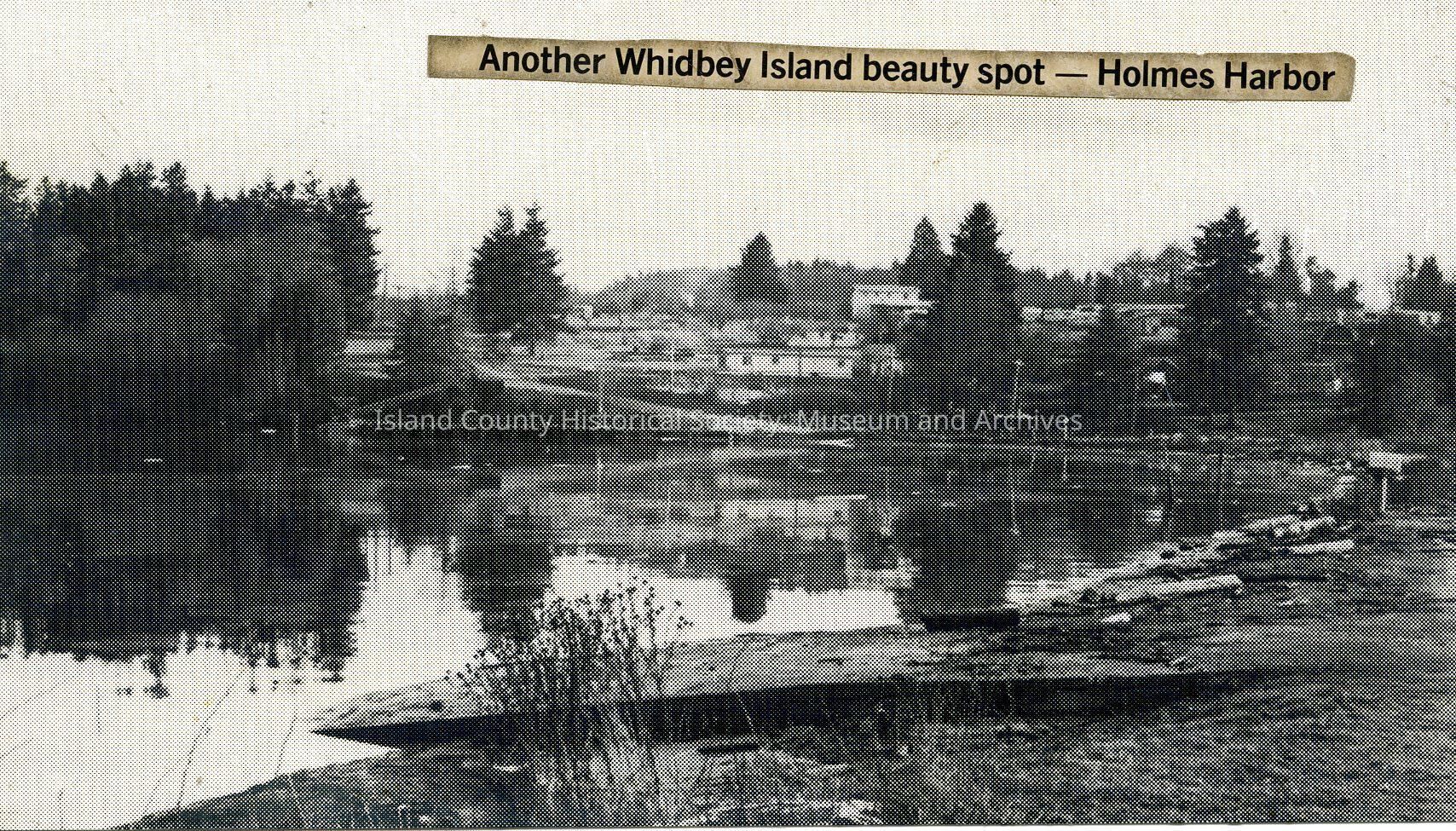 A black and white photo of water and buildings in the distance. The front reads "Another Whidbey Island Beauty Spot - Holmes Harbor"