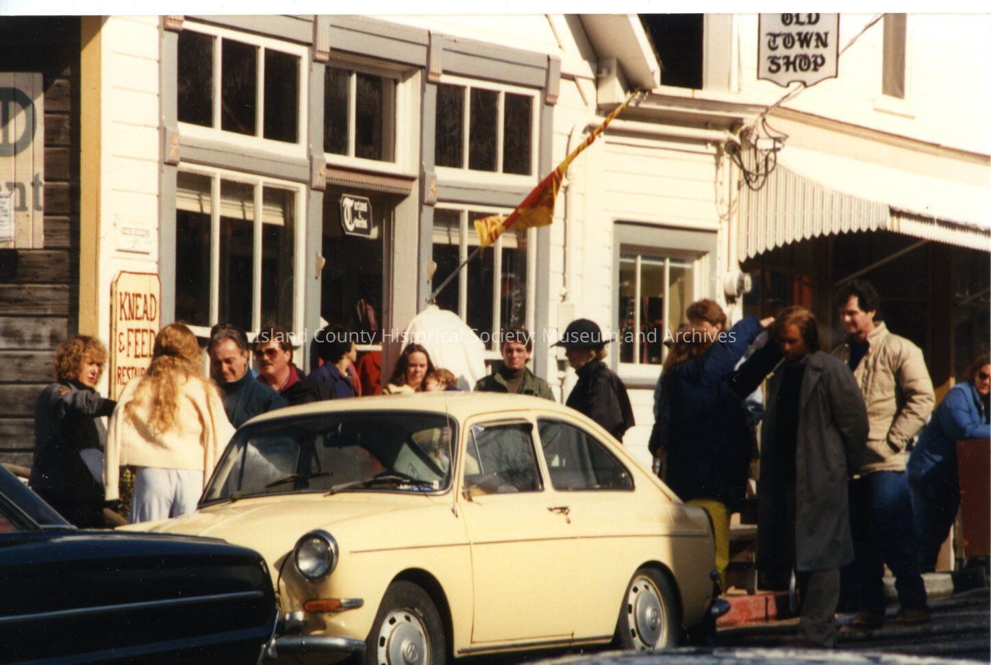 The Coupeville site of the Twentieth Century Fox film "War of the Roses", released in December 1989. This view is of the storefront for Coupeville business Knead & Feed on the water side of Front Street in Coupeville. The second and third person's from the left are likely actors Michael Douglas and Kathleen Turner There are no notes on the reverse of the photo.Made/Created