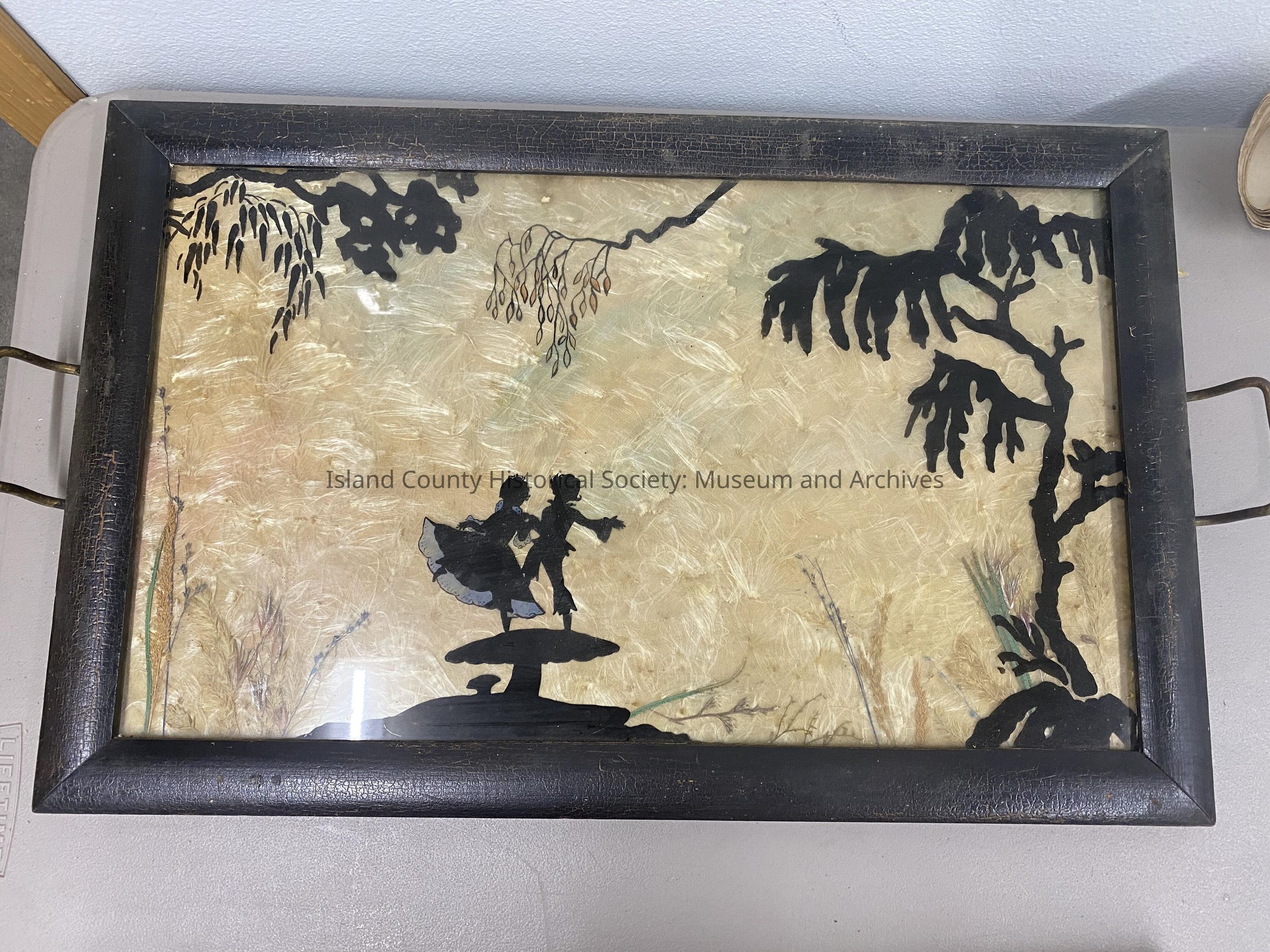 Including - A glass serving tray with pressed botanicals under the glass. There is a silhouette of a couple dancing as well. The tray has a black rim and gold handles. It was owned by Elva Hesselgrave.Collection