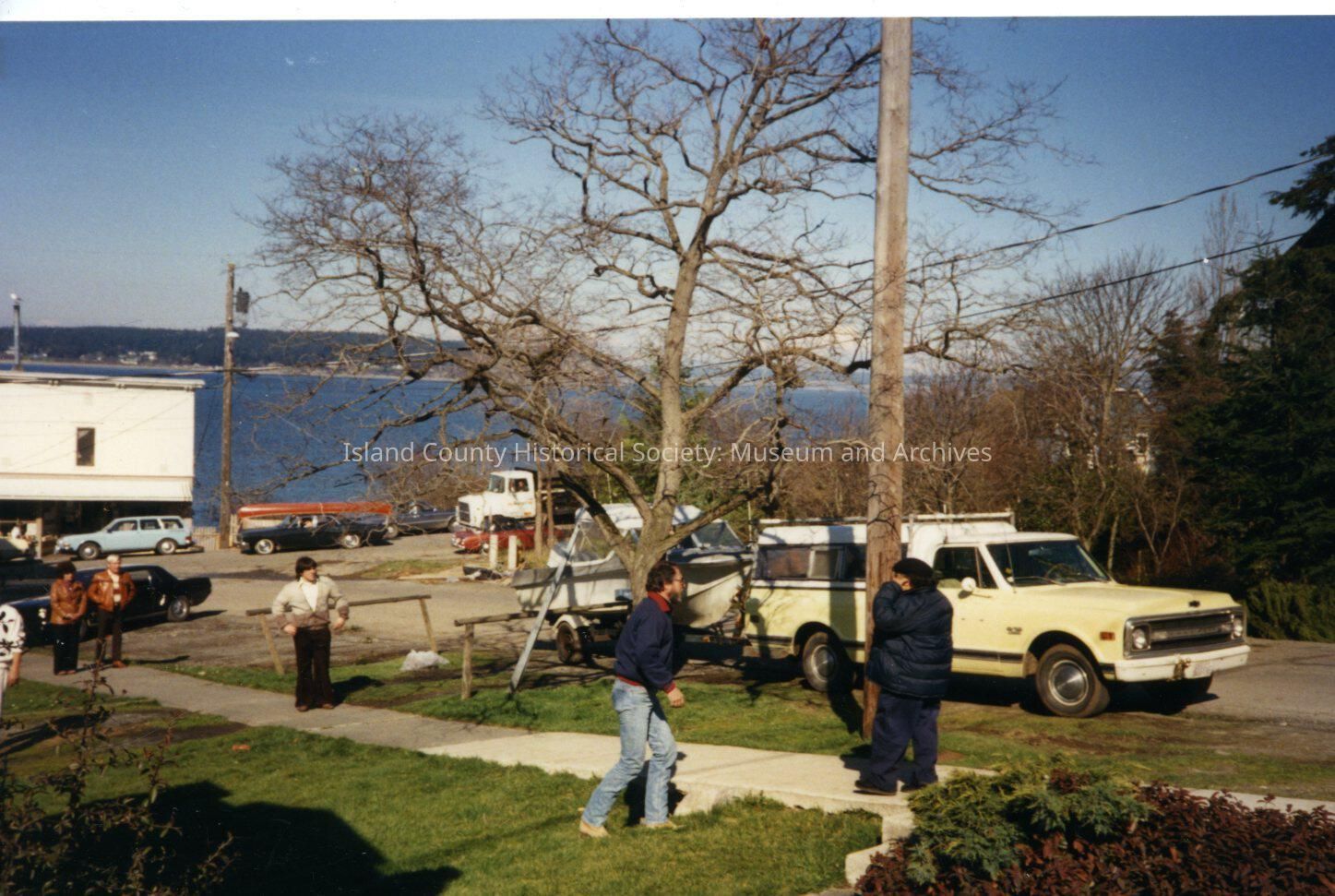 The Coupeville site of the Twentieth Century Fox film "The War of the Roses", released in December 1989. This view is of Main Street and its intersection with Front Steet in Coupeville. It is possible that the vehicles in the photo are 'props'.Notes on the reverse are: "War of the Roses"..Made/Created