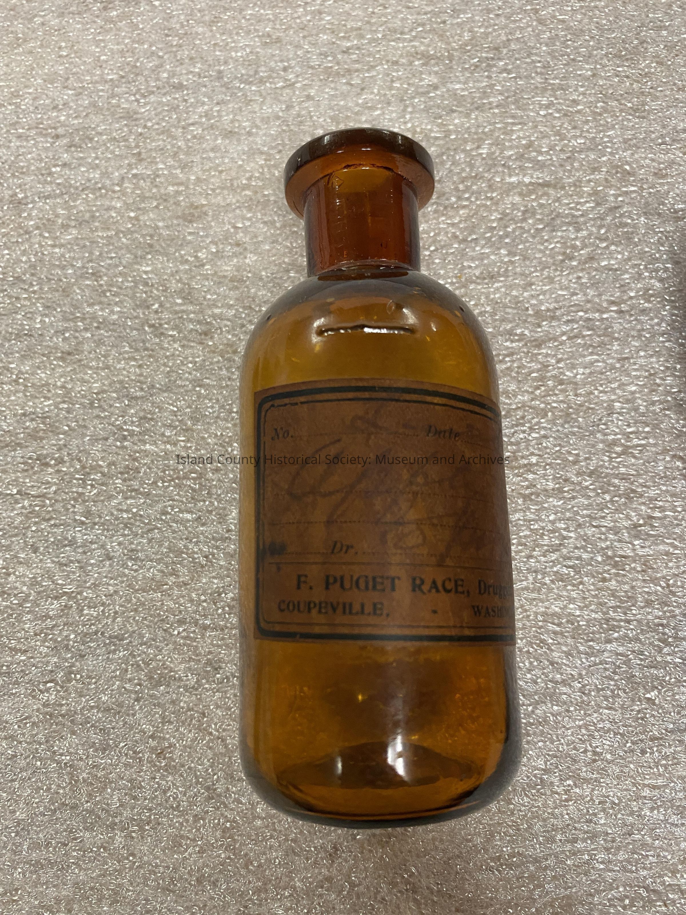 A amber colored bottle with a F. Puget Race Druggist label, Coupeville WA. Collected by Jimmie Jean Cook.