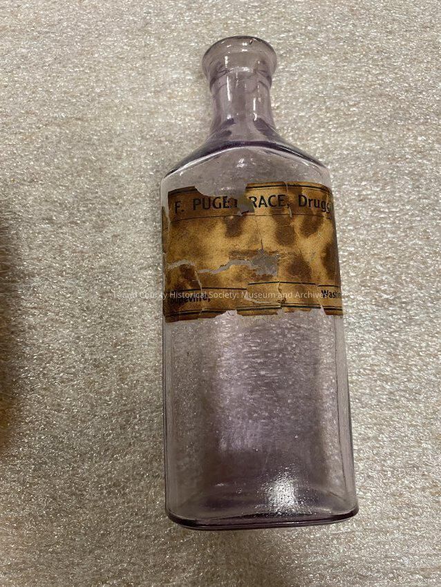 A purple glass bottle, rectangular in shape, with a F. Puget Race Druggist label, Coupeville WA. Collected by Jimmie Jean Cook.Collection